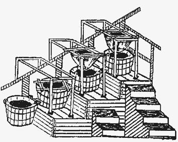 VIII. БАТАРЕЙНАЯ ЭКСТРАКЦИЯ РАЗМОЛОТОЙ СОСНОВОЙ ХВОИ И ПОЛУЧЕНИЕ ИЗ НЕЕ СОКА Свежая хвоя содержит около 75 проц. воды, в которой растворен весь витамин 0, сахар, горькие вещества хвои и пр. Весь этот раствор и называется соком. Сильным гидравлическим прессом можно отжать через плотную ткань, из хорошо размолотой хвои не больше половины сока. Остальная же часть сока остается в мезге. Поэтому приходится дополнительно выщелачивать эту часть сока водой, получая в конечном итоге сильно разбавленный сок. Для того чтобы возможно проще извлечь из размолотой хвои весь её сок я получить его крепким, почти не разбавленным, следует применять так назыв. «батарейную экстракцию» размолотой хвои водой. Ввиду того, что наиболее интересной для нас составной частью хвои является витамин С и сахар (глюкоза), легко растворимые в холодной воде, а не желательными для нас являются горькие и смолистые вещества, трудно растворимые в холодной, но легче в подогретой воде, батарейную экстракцию хорошо размолотой хвои следует вести только холодной водой. При этом сок будет получен менее горьким, с меньшим содержанием смолистых веществ. Для экстракции хвои следует применять хорошую, не хлорированную питьевую воду, колодезную, артезианскую и проч. Если вода хлорирована, то её необходимо кипятить, а затем остужать. Ввиду чрезвычайной лёгкости и быстроты выщелачивания витамина С из хорошо размолотой хвоя в течение первых же 3—5 минут, наиболее удобным типом аппаратов для батарейной экстракции являются небольшие, широкие, несколько суженные книзу и невысокие кадушки (30—40 см.), ёмкостью в 50— 80 литр., расположенные на ступенчатых площадках одна под другой. (См. рис. И). Такая батарейка ив 3-х кадушек обеспечивает извлечение 92 — 96. процентов витамина С, имеющегося в хвое. Для увеличения пропускной способности батареи и упрощения отделения мезги от сока, размолотая хвоя принимается в мешки из грубого холста, укрепленные на деревянных рамках и погруженные мешковиной в кадушки. Над кадушками укрепляются простые стойки для подвешивания на них вынутых для обтекания и для отжима сока рамок с мешочными фильтрами, заполненными хвойной мезгой. Каждая кадушка — панок имеет внизу деревянный кран для спуска через него сока в нижележащую. Готовый, наиболее крепкий сок—первач, спускается в приёмный чанок ёмкостью в 200—300 литров. Самая техника экстракции в батарее из 3-х чанков осуществляется по принципу противотока следующим образом: 1. В фильтрационный мешок первого, наиболее низко расположенного чанка, «залитого на 2 объема соком из вышестоящего чанка (или в начале экстракции—водой), принимается либо прямо из хобота мясорубки-волчка, либо через приёмный из-под мясорубки деревянный ушат, при хорошем перемешивании, размолотая и стодневная хвоя. Для лучшей полноты экстракции и облегчения работы не следует перегружать фильтровальный мешок мезгой, а каждые 30—40 минут наполнения и перемешивания поднимать фильтр на стойку для обтекания и ручного отжима. Взамен вынутого на обтекание мешка с мезгой №1 в чанок вкладывается свежий фильтр, в который и принимается в течение 30—40 минут следующая порция № 2 размолотой хвои при возможно частом перемешивании веселком. Обтекшая в течение 10—15 мин. мезга № 1 отжимается перекручиванием мешковины руками, а но окончании отжима фильтр вместе