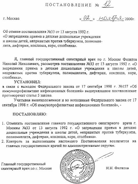 ПОСТАНОВЛЕНИЕ Главного государственного санитарного врача по г. Москве