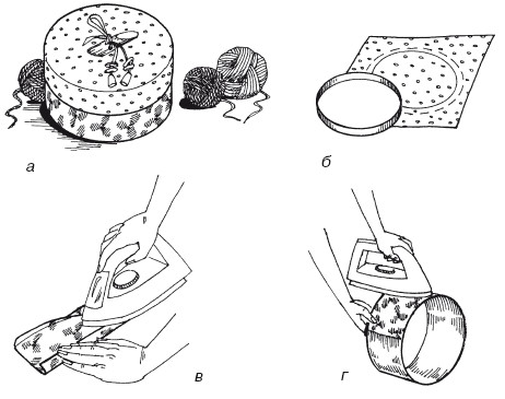 Подарки к празднику Во все времена особенно ценились подарки, изготовленные собственными руками. Предлагаем вам сделать некоторые симпатичные вещицы, которые, вне всякого сомнения, понравятся вашим подругам. Помимо самих подарков, большое значение придается их упаковке, которую тоже можно изготовить самостоятельно. Шкатулки В шкатулках очень удобно хранить бижутерию, объемные цветы, всевозможные сувениры и прочие милые сердцу мелочи, а изготовить такие подарки можно из обычных картонных коробок круглой формы. Для этого достаточно обтянуть их лоскутами красивых тканей (рис. 71, а). Предлагаем вам сделать шкатулки высотой 11 и 8 см и диаметром 19 и 14 см соответственно. Для изготовления одной шкатулки подготовьте следующие материалы и инструменты: – готовая круглая картонная коробка указанного размера; – бумага ручной выделки; – декоративные яйца и перья; ![]() Рис. 71. Обтянутые тканью шкатулки: а – внешний вид; б – оформление верхней части крышки; в – подготовка тканевой полосы для боковины крышки; г – приутюживание тканевой полосы к боковине коробки – ткань шириной 140 см, состоящая из 40 % шелка и 60 % пеньки; – флизофикс; – шнур для упаковки подарков; – узкий кожаный ремешок; – крупные пуговицы из кожи или дерева; – портновские ножницы; – универсальный клей. Сначала нужно превратить обычную коробку из картона или папье-маше в декоративную шкатулку. Для этого мы обтянем ее тканью. Наилучшим образом для этой цели подходят лен, хлопок или шелк. Главное условие: выбранная вами ткань должна выдерживать среднюю температуру утюга (позиция 2 на терморегуляторе). Потребуется также флизофикс – двухсторонний клеевой флизелин, предназначенный специально для выполнения аппликаций. Этот материал состоит из двух слоев – очень тонкого двухстороннего клеевого и бумажного. Клеевой слой флизофикса под воздействием высокой температуры во время приутюживания приклеивается к ткани. Наложите флизофикс на изнаночную сторону ткани бумажной стороной вверх и приутюжьте. Переведите очертания крышки на бумажный слой флизофикса и вычертите припуск шириной 1 см (рис. 71, б). Вырежьте круг из ткани с учетом припуска. На припуске сделайте надсечки с интервалом 0,5 см. Бумажный слой удалите. Затем наложите круг на крышку коробки клеевой стороной вниз и приутюжьте его. Выкройте полосу требуемой ширины для боковины крышки. Не забудьте при этом предусмотреть припуск шириной 1 см по всему ее периметру. Вырежьте из флизофикса полосу шириной 1 см и приутюжьте ее к припуску по одному из продольных срезов тканевой полосы (рис. 71, в). Удалите бумажный слой флизофикса и заутюжьте припуск на изнаночную сторону. Далее вырежьте из флизофикса еще одну полоску такого же размера, как и первая полоса, и приклейте ее на ткань. Удалите бумажный слой флизофикса. Полосу наложите на боковую часть крышки обработанным краем вверх. Приутюжьте ее, поместив сверху обработанный конец. Заверните припуск по нижнему продольному срезу полосы на внутреннюю сторону крышки и заутюжьте его носиком утюга. Выкройте полосу для боковой стороны коробки, оставляя припуски по 2 см по всему периметру. На одном конце подготовленной тканевой полосы заутюжьте припуск на изнаночную сторону. Приутюжьте флизофикс по всей ширине полосы и удалите бумажный слой. Подготовленную полосу приутюжьте к боковой ст