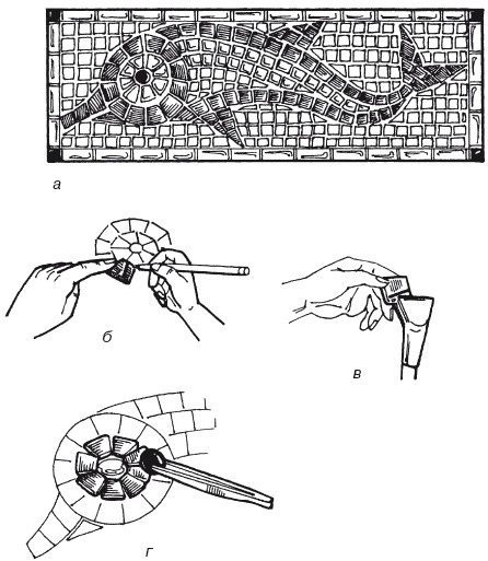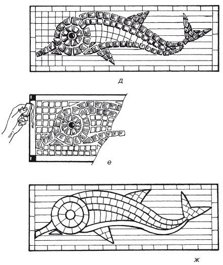 Симпатичные мелочи Облик интерьера, в каком бы стиле он ни был выполнен, неизменно преображается благодаря милым безделушкам и всевозможным симпатичным мелочам, сделанным руками хозяйки дома, особенно если они выглядят не только мило, но и уместно и размещены со вкусом, а потому гармонично смотрятся на фоне всех остальных вещей. Эти очаровательные декоративные штучки радуют глаз и создают в доме неповторимую атмосферу теплоты и уюта. Мозаичное панно «Морской конек» Для изготовления мозаичного панно «Морской конек» (рис. 75, а) подготовьте следующие материалы и инструменты: – доска размером 28 х 14 х 1 см; – стеклянные мозаичные плитки размером 2 х 2 см: 30 розовых, 10 фиолетовых, 15 золотистых, 90 голубых и 80 синих квадратиков; – 1 бусинка темного цвета для глаза конька; – кусачки для плитки; – защитные очки; – пинцет; – клей ПВА; – кисточка; – копировальная бумага; – линейка; – карандаш; – тонкий фломастер; – затирка для плиток светлого цвета. ![]() Рис. 75. Мозаичное панно «Морской конек»: а – готовое изделие; б – нанесение на доску мотива узора; в – вырезание фрагментов нужных очертаний; г – наклеивание фрагментов мозаики вокруг глаза конька ![]() Рис. 75 (продолжение). Мозаичное панно «Морской конек»: д – выкладывание контура тела конька; е – заполнение пространства вокруг конька плитками голубого цвета; ж – схема мотива узора Переведите мотив узора на доску (рис. 75, б), загрунтуйте ее слегка разбавленным водой клеем ПВА и дайте ему высохнуть. Мотив узора приведен на рис. 75, ж. Начните выкладывать конька с очертаний глаза. Для этого на плитках розового и золотистого цветов фломастером начертите контуры соответствующих секторов. Используя кусачки, вырежьте фрагменты нужных очертаний (рис. 75, в). При выполнении этой операции обязательно наденьте защитные очки, чтобы не повредить глаза случайно отлетевшими кусочками плиток. Подготовленные фрагменты мозаики приклейте на соответствующие им места, как показано на рис. 75, г. Посередине между фрагментами приклейте бусинку. Контуры тела конька выложите квадратными и клиновидными плитками (рис. 75, д), чередуя элементы фиолетового и розового цветов. Вырезав треугольники из золотистой плитки, выложите ими спинной плавник конька. Нижнюю часть плавника оформите розовыми и золотистыми клиновидными плитками. Выложив плитками все тело конька, заполните пространство вокруг него деталями голубого цвета (рис. 75, е). Чтобы ваша работа приобрела завершенный вид, разрежьте на половинки 18 плиток синего цвета, и две золотистые плитки – на четвертинки (для узора нам понадобится 6 четвертинок). Приклейте половинки плиток по внешнему контуру панно, а четвертинки – по его уголкам. При этом следите за тем, чтобы обрезанные края половинок были обращены внутрь изображения, а гладкие – наружу. Когда клей высохнет, разведите затирку, нанесите ее на мозаичное панно, вотрите в промежутки, дайте слегка подсохнуть и протрите панно влажной тканью. Работа завершена. Теперь осталось только повесить панно на стену. Перламутровые сердечки Сердечки необязательно шить. Их можно вырезать из ДСП и обклеить квадратной перламутровой мозаикой. Пластинки, расположенные по краям, обрежьте, придав им нужную форму. После того как клей подсохнет, затрите зазоры между мозаичными пластинками специально предназначенной для этой цели шпакл