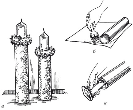 Светильники и подсвечники Неотъемлемым элементом интерьера являются всевозможные светильники. Проявив старание и фантазию, вы сможете превратить обычную настольную лампу в настоящее произведение искусства, которое станет еще одним украшением вашей квартиры. Ни один праздник или романтическая вечеринка не обходятся без свечей. Необязательно покупать эти аксессуары в магазине. Попробуйте изготовить оригинальные подсвечники своими руками или декорировать обычные восковые свечки. Светильники с подвесками Если вы неисправимый романтик, вам наверняка понравится абажур, обтянутый тончайшим шелком и украшенный изящными подвесками. Он подойдет для интерьера любого стиля и внесет в него экзотическую нотку и неповторимую изысканность. Для изготовления светильника вам потребуются: – готовый цилиндрический абажур белого цвета высотой 15 см и диаметром 9 см; – пленка для абажуров; – клеевая лента с двухсторонним клеевым покрытием; – шелковая ткань для сари; – тесьма с подвесками для абажуров; – клей для текстиля; – ножницы; – сантиметровая лента. Вырежьте из пленки для абажуров полосу шириной, равной высоте абажура (в нашем примере 15 см), и длиной, равной обхвату абажура плюс 1 см (у нас 29,5 см). Пленку обтяните шелковой тканью: приутюжьте ткань и разложите на столе изнаночной стороной вверх. Удалите с пленки бумажный слой, наложите ее на ткань и приклейте, прижимая и разглаживая по направлению от центра к краям. Излишки ткани обрежьте, оставив по всему контуру детали припуски шириной 1 см. Припуски по боковым краям абажура прикрепите клеевыми полосками с его внутренней стороны. Припуски по верхнему и нижнему срезам шелковой детали абажура надсеките. С изнаночной стороны вдоль линий верхнего и нижнего краев абажура приклейте клеевые полосы. Обклейте шелковой деталью абажур внахлест. Лежащий сверху боковой край закрепите двухсторонней клеевой лентой. Припуски по верхнему и нижнему срезам отверните на внутреннюю сторону абажура и приклейте их клеем для текстиля. С помощью двухсторонней клеевой ленты зафиксируйте вдоль нижнего среза абажура тесьму с подвесками. Вместо шелковой ткани абажур можно декорировать бумажными салфетками с красивым орнаментом. Для их наклеивания используйте клей для декупажа. Новый наряд для настольной лампы Создать новый наряд для настольной лампы с белым абажуром на фарфоровой ножке вам помогут краски, кисти и клей. Диаметр абажура в нашем примере составляет 5 см, а высота ножки – 2 см. Для оформления декора потребуются следующие материалы и инструменты: – шелковая ткань оранжевого цвета (для абажура); – желтая, оранжевая, красная, синяя и зеленая художественные краски; – блестящий прозрачный лак; – клей; – широкая и тонкая кисти; – ножницы; – карандаш. Сначала разложите на столе шелковую ткань и вычертите на ней контур абажура, прокатив его по ткани. По контурам детали обозначьте припуски на швы: по верхнему и нижнему срезам – по 5 см, а по боковым срезам – по 1 см. Вырежьте шелковую деталь, нанесите на нее клей, аккуратно наложите на абажур и разгладьте сухой широкой кистью по направлению от центра абажура к его внешним краям. Припуски на швы обрежьте до ширины 1 см, отверните на внутреннюю сторону абажура и приклейте. Ножку лампы распишите разноцветными поперечными полосками, вращая ее вокруг оси. 