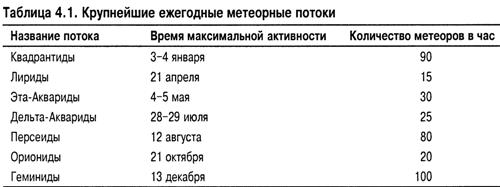 Нам кажется, что во время этого "дождя" все метеоры появляются из одной точки на небе, которая называется радиантом. Самый известный метеорный поток — это Персеиды, при прохождении Земли через него можно увидеть целых 80 метеоров в час. Персеиды названы так, поскольку кажется, что они появляются со стороны созвездия Персея. Метеорные потоки вообще часто называют по имени созвездий или ярких звезд (таких как η Водолея), расположенных рядом с их радиантом. Некоторые другие метеорные потоки порождают такие же или даже более интенсивные метеорные дожди, чем Персеиды, но увидеть их удается далеко не всем. Дело в том, что Персеиды появляются в теплые августовские ночи, т. е. в идеальное время для астрономических наблюдений, а другие крупные метеорные потоки — Геминиды и Квадрантиды — можно увидеть в такие холодные месяцы, как декабрь и январь, когда погода гораздо хуже и активность наблюдателей заметно снижается. В табл. 4.1 перечислены самые крупные метеорные потоки, появляющиеся ежегодно; указаны также дни, в которые интенсивность метеорных потоков обычно достигает максимума. Одни метеорные дожди продолжаются несколько дней, другие — несколько недель, но только в определенные дни можно увидеть максимальное количество метеоров в час; в остальное время "дождь льет" гораздо слабее. Но Квадрантиды можно наблюдать только на протяжении одной ночи или даже нескольких часов. Радиант Квадрантид находится в северо-восточном углу созвездия Волопаса. Они были названы по имени созвездия, которое можно найти на звездных картах XIX века, но в настоящее время его больше официально не признают. В придачу к потере созвездия, по имени которого они были названы, Квадрантиды, похоже, потеряли и породившую их комету, поскольку их происхождение все еще остается загадкой для астрономов. Геминиды — это, похоже, единственный метеорный поток, связанный с орбитой астероида, а не кометы. Хотя этот "астероид", скорее всего, представляет собой "мертвую" комету, больше не испускающую газ и пыль, из которых формируется ядро и хвост кометы. (О кометах мы подробнее поговорим в следующем разделе.) Леониды — это метеорный поток, наблюдаемый примерно 17 ноября ежегодно. Его необычность в том, что из года в год интенсивность потока остается на довольно низком уровне, но каждые 33 года она резко возрастает и остается высокой на протяжении нескольких лет подряд. Например, в ноябре 1966 года и на рубеже столетий (в 1999 и 2001/2002 годах) наблюдался необычайно интенсивный поток Леонид. А 19 ноября 2002 года на Чукотке наблюдался настоящий метеорный шторм[9] — до 3000 метеоров в час!