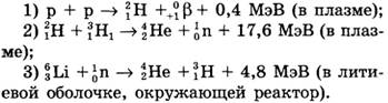 ЯДЕРНЫЙ СИНТЕЗ Ядерный (термоядерный) синтез — это процесс слияния легких ядер, образующих более тяжелые ядра. В результате выделяется энергия при условии, что образовавшееся ядро содержит не более 50 нейтронов и протонов. Чтобы два ядра слились, они должны приблизиться друг к другу на расстояние порядка 2–3 х 10-15 м, оказавшись в радиусе действия ядерных сил. Начальная кинетическая энергия двух сливающихся ядер должна быть порядка МэВ; только в этом случае можно преодолеть электростатические силы отталкивания между ядрами и позволить им приблизиться на расстояние 2–3 х 10-15 м. Такие условия создаются внутри звезды в результате чрезвычайно высокой температуры, которая поддерживается энергией, выделяемой при слиянии ядер водорода (протонов) и образовании ядер гелия и других элементов. Энергия, выделяемая на одно ядро гелия, равна приблизительно 7 МэВ на нуклон, что значительно больше энергии, выделяемой при делении ядер. Реакция синтеза может поддерживаться в термоядерном реакторе, где магнитные поля удерживают плазму из ионизированного водорода при пропускании через нее тока с очень большой силой, порядка 106 А. Этого тепла достаточно, чтобы вызвать реакцию синтеза, при которой из ядер водорода образуются ядра гелия и других более тяжелых элементов; при этом наблюдаются следующие стадии: Тритий (31Н), образующийся в литиевой оболочке, удаляется из нее и подается в плазму. Нейтроны, выделяемые в плазме, поглощаются ядрами лития; при этом образуются ядра трития и гелия. Таким образом, общий процесс выделяет 22,8 МэВ энергии на каждые четыре протона и нейтрона, из которых образуется ядро гелия. Сырьем служат водород и литий. Теоретически энергии, выделяемой при реакции синтеза, должно быть более чем достаточно для поддержания высокой температуры плазмы. Однако в настоящий момент невозможно добиться того, чтобы в таком реакторе выделялось больше энергии, чем необходимо для поддержания реакции синтеза. |