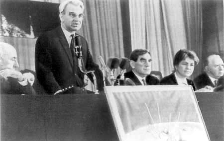 (Слева направо: сидят Ю.А. Гагарин, П.И. Беляев, В.В. Терешкова, А.А. Леонов, В.М. Комаров, Н.П. Каманин; стоят П.Р. Попович, Ю.Н. Орешкин, Г.С. Титов, Б.Б. Егоров, К.П. Феоктистов, В.П. Мишин, С.О. Охапкин, К.И. Макаров, К.Д. Бушуев, Б.Е. Черток, А.Г. Николаев, В.Ф. Быковский)