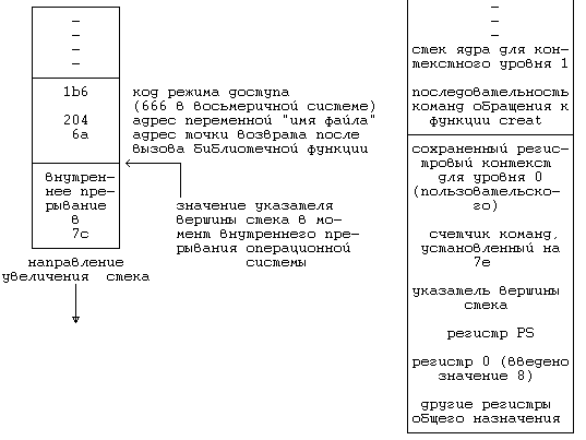 Рисунок 6.9. Пример векторов прерывания 3. Вызов программы обработки прерывания. Стек ядра для нового контекстного уровня, если рассуждать логически, должен отличаться от стека ядра предыдущего контекстного уровня. В некоторых разработках стек ядра текущего процесса используется для хранения элементов, соответствующих программам обработки прерываний, в других разработках эти элементы хранятся в глобальном стеке прерываний, благодаря чему обеспечивается возврат из программы без переключения контекста. 4. Программа завершает свою работу и возвращает управление ядру. Ядро исполняет набор машинных команд по сохранению регистрового контекста и стека ядра предыдущего контекстного уровня в том виде, который они имели в момент прерывания, после чего возобновляет выполнение восстановленного контекстного уровня. Программа обработки прерываний может повлиять на поведение процесса, поскольку она может внести изменения в глобальные структуры данных ядра и возобновить выполнение приостановленных процессов. Однако, обычно процесс продолжает выполняться так, как если бы прерывание никогда не происходило. алгоритм inthand /* обработка прерываний */ входная информация: отсутствует выходная информация: отсутствует { сохранить (поместить в стек) текущий контекстный уровень; установить источник прерывания; найти вектор прерывания; вызвать программу обработки прерывания; восстановить (извлечь из стека) предыдущий контекстный уровень; } Рисунок 6.10. Алгоритм обработки прерываний На Рисунке 6.10 кратко изложено, каким образом ядро обрабатывает прерывания. С помощью использования в отдельных случаях последовательности машинных операций или микрокоманд на некоторых машинах достигается больший эффект по сравнению с тем, когда все операции выполняются программным обеспечением, однако имеются узкие места, связанные с числом сохраняемых контекстных уровней и скоростью выполнения машинных команд, реализующих сохранение контекста. По этой причине определенные операции, выполнения которых требует реализация системы UNIX, являются машинно-зависимыми. На Рисунке 6.11 показан пример, в котором процесс запрашивает выполнение системной функции (см. следующий раздел) и получает прерывание от диска при ее выполнении. Запустив программу обработки прерывания от диска, система получает прерывание по таймеру и вызывает уже программу обработки прерывания по таймеру. Каждый раз, когда система получает прерывание (или вызывает системную функцию), она создает в стеке новый контекстный уровень и сохраняет регистровый контекст предыдущего уровня. 6.4.2 Взаимодействие с операционной системой через вызовы системных функцийТакого рода взаимодействие с ядром было предметом рассмотрения в предыдущих главах, где шла речь об обычном вызове функций. Очевидно, что обычная последовательность команд обращения к функции не в состоянии переключить выполнения процесса с режима задачи на режим ядра. Компилятор с языка Си использует библиотеку функций, имена которых совпадают с именами системных функций, иначе ссылки на системные функции в пользовательских программах были бы ссылками на неопределенные имена. В библиотечных функциях обычно исполняется команда, переводящая выполнение процесса в режим ядра и побуждающая ядро к запуску исполняемого кода системной