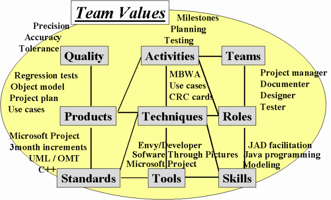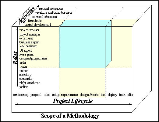 Компоненты и объем методологии Под "методологией" я понимаю то, что написано в качестве первого толкования этого слова в Американском словаре Miriam-Webster: "ряд связанных между собой методов или техник". Оксфордский словарь толкует это слово только как "изучение методов". В этой статье я использую американский вариант. ( Для интересующихся: в "Толковом словаре русского языка" Ожегова это слово трактуется как "принципы и способы организации теоретической и практической деятельности" и "совокупность методов, применяемых в какой-либо науке". -- прим. переводчиков ) Под "размером" методологии я имею в виду число элементов управления в ней, к которым относятся поставляемые артефакты, стандарты, виды деятельности, меры качества и т.д. "Плотность" методологии измеряется уровнем детализации и связности, необходимых для ее осуществления. Более высокая плотность соответствует жесткому контролю или сильному формализму. "Вес" методологии определяется путем умножения размера на плотность (только теоретически, так как я не привожу здесь никаких цифр относительно размера и плотности). Я буду говорить также о "размере проекта". Под этим термином я подразумеваю число людей, работающих над проектом, деятельность которых необходимо координировать. Нередко возникает мнение, что размер проекта соответствует размерам задачи, но все не так просто. Размер задачи нельзя определить в абсолютных величинах, так как всегда может появиться новый человек, который сумеет разглядеть в этой задаче некоторый упрощающий паттерн. Именно поэтому я старательно разграничиваю понятия "размер проекта" и "размер задачи". ![]() Рисунок 1. Составляющие методологии (с примерами). Методология включает в себя, по крайней мере, те предметы и темы, которые указаны на рис. 1: роли, навыки, команды разработчиков, инструментарий, техники, виды деятельности, стандарты, рабочие продукты, меры качества и систему ценностей, принятых в команде разработчиков. В большинстве своем, эти пункты не нуждаются в дополнительных объяснениях. Под "стандартами" мы имеем в виду нотационные стандарты (например, диаграммы и языки программирования), которые используются при выполнении данного проекта. Есть также стандарты управления и принятия решений, например, использование инкрементных разработок. И, наконец, у нас есть некоторая система условностей - стандартов, которые определяются для данного конкретного проекта. Менее очевидно, что такое "система ценностей, принятых в команде разработчиков". Под этим термином мы понимаем то, к чему стремится команда, как они предпочитают общаться и работать. Для команд с различными системами ценностей будут эффективны различные методологии. У методологии есть "объем", который определяется протяженностью жизненного цикла проекта, разнообразием ролей и видов их деятельности, которые и пытается покрыть собой методология (см. рис. 2): ![]() Рисунок 2. "Объем" методологии. Некоторые компании работают по методологиям, которые покрывают весь процесс разработки программного продукта - от первого звонка клиента до поддержки и сопровождения уже работающей системы. При этом все роли оплачиваются из фондов проекта. Большая часть тех коммерческих книг, которые именуются "методологиями", посвящены, как правило, описанию только одной роли, а именно, роли проектировщика/программис