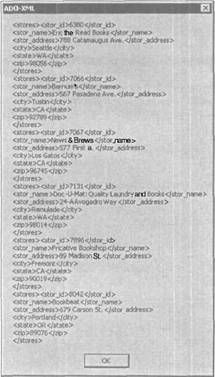 Для чтения только схемы данных (и игнорирования данных) предусмотрена перегруженная версия метода ReadXmlSchema, которая может применяться для считывания схемы объектов DataTable объекта DataSet так, как показано ниже. MyDataSet.ReadXmlSchema("MySchemaFile.xml") Те же четыре источника данных (файл, объекты Stream, TextReader и XmlReader) могут использоваться вместе с методом ReadXmlSchema. Объект DataSet имеет аналогичный набор методов для записи XML-данных. Запись XML-данныхПосле загрузки в объект DataSet (независимо от способа и места загрузки) данные и/или схемы данных можно записать в XML-формате (с XML-схемой или без нее). Для демонстрации способов записи данных в XML-формате выполните перечисленные ниже действия. 1. Создайте в форме новую кнопку сразу под кнопкой Read XML, перетаскивая ее из панели инструментов. 2. В окне свойств Properties укажите значение btnWriteXML для свойства (Name) и значение Write XML для свойства Text этой кнопки. 3. Затем в определении класса формы frmXML введите код из листинга 10.3. Листинг 10.3. Код сохранения содержимого объекта DataSet в виде XML-файлаPrivate Sub btnWriteXML_Click(ByVal sender As System.Object, _ ByVal e As System.EventArgs) Handles btnWriteXML.Click Dim dsSales As New DataSet() Dim en As New SqlConnection _ ("data source=localhost;initial catalog=pubs;user id=sa") Dim daAuthors As New SqlDataAdapter("select * from sales", en) Dim daPublishers As New SqlDataAdapter("select * from stores", en) ' Загрузка реляционных данных из базы данных. daAuthors.Fill(dsSales, "Sales") daPublishers.Fill(dsSales, "Stores") ' Запись XML-данных в файл dsSales.WriteXml("…\StoreSales.xml") ' Запись схемы в XSD-файл. dsSales.WriteXmlSchema("…\StoreSales.xsd") End Sub В этой подпрограмме создаются два объекта — адаптера данных (daAuthors и daPublishers), которые затем используются для вставки данных в объект dsPubs из двух таблиц базы данных pubs СУБД SQL Server. В листинге 10.4 приведено содержимое файла StoreSales.xml, который создается в результате выполнения этой подпрограммы. Обратите внимание на то, что данный XML-документ содержит записи о продажах, а затем записи о магазинах. Этот подход имеет смысл, так как между ними не задано никакого отношения. Если бы таблицы Sales и Stores были связаны, то эти записи можно было вложить друг в друга. Пример такого вложения приводится далее, в бизнес-ситуации 10.1. ЛИСТИНГ 10.4. Содержимое файла StoreSales.xml<?xml version="1.0" standalone="yes"?> <NewDataSet> <Sales> <stor_id>6380</stor_id> <ord_num>6871</ord_num> <ord_date>l994-09-14T00:00:00.0000000+02:00</ord_date> <qty>5</qty> <payterms>Net 60</payterms> <title_id>BU1032</title_id> </Sales> <Sales> <stor_id>6380</stor_id> <ord_num>722a</ord_num> <ord_date>l994-09-13T00:00:00.0000000+02:00</ord_date> <qty>3</qty> <payterms>Net 60</payterms> <title_id>PS2091</title_id> </Sales> <Sales> <stor_id>7066</stor_id> <ord_num>A2976</ord_num> <ord_date>1993-05-24T00:00:00.0000000+02:00</ord_date> <qty>50</qty> <payterms>Net 30</payterms> <title_id>PC8888</title_id> </Sales> <Sales> <stor_id>7066</stor_id> <ord_num>QA7442.3</ord_num> <ord_date>1994-09-13T00:00:00.0000000+02:00</ord_date> <qty>75</qty> <payterms>ON invoice</payterms> <title_id>PS209K/title_id> </Sales> <Sales> <stor_id>7067</stor_id> <ord_num>D4482</ord_num> <ord_date>1994-09-14T00:00:00.0000000+02:00</ord_date> <qty>10</qty> <payterms>Net 60</payterms> <title_id>PS2091</title_id> </Sales> <Sales> <stor_id>7067</stor_id> <ord_nurn>P2121</ord_num> <ord_date>1992-06-15T00:00:00.0000000+02:00</ord_date> <qty>40</qty> <payterms>Net 30</payterms> <title_id>TC3218</title_id> </Sales> <Sales> <stor_id>7067</stor_id> <оrd_num>P2121</ord_num> <ord_date>1992-06-15T00:00:00.0000000+02:00</ord_date> <qty>20</qty> <payterms>Net 30</payterms> <title_id>TC4203</title_id> </Sales> <Sales> <stor_id>7067</stor_id> <ord_num>P2121</ord_num> <ord_date>1992-06-15T00:00:00.0000000+02:00</ord_date> <qty>20</qty> <payterms>Net 30</payterms> <title_id>TC7777</title_id> </Sales> <Sales> <stor_id>7131</stor_id> <ord_num>N914008</ord_num> <ord_date>1994-09-14T00:00:00.0000000+02:00</ord_date> <qty>20</qty> <payterms>Net 30</payterms> <title_id>PS2091</title_id> </Sales> <Sales> <stor_id>7131</stor_id> <оrd_num>N914014</оrd_num> <ord_date>1994-09-14T00:00:00.0000000+02:00</ord_date> <qty>25</qty> <payterms>Net 30</payterms> <title_id>MC3021</title_id> </Sales> <Sales> <stor_id>7131</stor_id> <ord_num>P3087a</ord_num> <ord_date>1993-05-29T00:00:00.0000000+02:00</ord_date> <qty>20</qty> <payterms>Net 60</payterms> <title_id>PS1372</title_id> </Sales> <Sales> <stor_id>7131</stor_id> <ord_num>P3087a</ord_num> <ord_date>1993-05-29T00:00:00.0000000+02:00</ord_date> <qty>25</qty> <pa