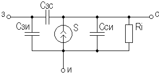 ãäå Uîòñ — íàïðÿæåíèå îòñå÷êè, Iñè — òîê ñòîêà ïðè Uçè=0  (ëèáî ïðè Uçè=2Uîòñ äëÿ ÏÒ â ðåæèìå îáîãàùåíèÿ, ñì. ðèñóíîê 2.33 â ïîäðàçäåëå 2.10). Ñ ïîìîùüþ ðåçèñòîðà Rè, ïîìèìî çàäàíèÿ íåîáõîäèìîãî íàïðÿæåíèÿ ñìåùåíèÿ, â êàñêàä ââîäèòñÿ ÎÎÑ, ñïîñîáñòâóþùàÿ òåðìîñòàáèëèçàöèè (ó ÏÒ êàê è ó ÁÒ íàáëþäàåòñÿ ñèëüíàÿ òåìïåðàòóðíàÿ çàâèñèìîñòü ïàðàìåòðîâ), íà ÷àñòîòàõ ñèãíàëà ýòà ÎÑ óñòðàíÿåòñÿ ïóòåì âêëþ÷åíèÿ Cè. Ãðàôè÷åñêè ïðîèëëþñòðèðîâàòü ðàáîòó êàñêàäà ñ ÎÈ ìîæíî, èñïîëüçóÿ ïðîõîäíûå è âûõîäíûå ñòàòè÷åñêèå õàðàêòåðèñòèêè ÏÒ, ïóòåì ïîñòðîåíèÿ åãî äèíàìè÷åñêèõ õàðàêòåðèñòèê. Ïîñòðîåíèå âî ìíîãîì àíàëîãè÷íî êàñêàäó ñ ÎÝ è îòäåëüíî íå ðàññìàòðèâàåòñÿ. Íåòðóäíî ïîêàçàòü, ÷òî êàñêàä ñ ÎÈ, êàê è êàñêàä ñ ÎÝ, èíâåðòèðóåò âõîäíîé ñèãíàë. Íà ðèñóíêå 2.31 à,á,â ïðèâåäåíû, ñîîòâåòñòâåííî, ìàëîñèãíàëüíûå ñõåìû äëÿ îáëàñòåé Ñ×,Í×, è Â×. Ðèñóíîê 2.31. Ñõåìû êàñêàäà ñ ÎÈ äëÿ Ñ×, Â× è Í× Äëÿ ðàñ÷åòà ïàðàìåòðîâ óñèëèòåëüíîãî êàñêàäà ïî ïåðåìåííîìó òîêó óäîáíî èñïîëüçîâàòü ìåòîäèêó, îïèñàííóþ â ðàçäåëå 2.3, à ÏÒ ïðåäñòàâèòü ìîäåëüþ, ïðåäëîæåííîé â ðàçäåëå 2.4.2.  ðåçóëüòàòå ðàñ÷åòà â îáëàñòè Ñ× ïîëó÷èì: K0 = S0Rýêâ, ãäå Rýêâ= Rñ∥Rí; gâõ ≈ 1/Rç, gâûõ ≈ gñ = 1/Rç. Ýòè ñîîòíîøåíèÿ ïîëó÷åíû â ïðåäïîëîæåíèè, ÷òî íèçêî÷àñòîòíîå çíà÷åíèå âíóòðåííåé ïðîâîäèìîñòè òðàíçèñòîðà g22ý ìíîãî ìåíüøå gñ è gí. Ýòî óñëîâèå (åñëè íå áóäåò îãîâîðåíî îñîáî) áóäåò äåéñòâîâàòü è ïðè äàëüíåéøåì àíàëèçå óñèëèòåëüíûõ êàñêàäîâ íà ÏÒ.  îáëàñòè Â× ïîëó÷èì: