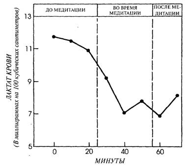 Сон против медитации Во время экспериментов было отмечено значительное снижение потребления кислорода (см. Рисунок 10). Как уже упоминалось в Главе 2, каждая клетка вырабатывает энергию, медленно сжигая питательные вещества, поступившие в организм вместе с пищей. Рисунок 10. Изменения в потреблении кислорода, связанные с достижением релаксации. Обратите внимание на значительное снижение уровня метаболизма. Чтобы «сжечь» питательные вещества, клетка расходует кислород, принесенный к ней потоком крови. Если сложить вместе метаболизм всех клеток, то получим общий метаболизм тела, то есть общее потребление кислорода для всего организма. Главное физиологическое изменение, связанное с медитацией, – понижение уровня метаболизма (см. Рисунок 9). Такое состояние пониженного метаболизма называется гипометаболизмом и соответствует состоянию полного расслабления. Как и во время сна, во время медитации потребление энергии в организме сильно снижается. Человек очень редко может достичь такого уровня гипометаболизма; чтобы его потребление кислорода было ниже, чем в состоянии покоя (когда он спокойно сидит или лежит). Действительно, слишком редко складываются такие условия, когда развивается гипометаболизм. Обычно такое происходит только в двух случаях: во время сна или во время зимней спячки у животных. Так как во время медитации потребление кислорода снижалось весьма существенно, сначала решили, что, возможно, это какая-то неизвестная ранее реакция человеческого организма, подобная зимней спячке. Единственный способ узнать, наступило ли состояние гипометаболизма – измерить ректальную температуру. Во время зимней спячки эта температура понижается. Но во время медитации у человека этот показатель не снижается, что и было установлено, так что медитация не имеет ничего общего с зимней спячкой. Но гипометаболическое состояние наступает также и во сне; можно ли сказать, что во время медитации происходят такие же физиологические изменения, как и во время сна? Нет, сходства очень мало. Потребление кислорода действительно снижается как во время сна, так и во время медитации. Однако существует значительная разница по величине этого понижения. Во время сна потребление кислорода снижается медленно и постепенно, через 4-5 часов сна оно уменьшается примерно на 8% от уровня бодрствования. Во время медитации снижение происходит за первые три минуты после ее начала и достигает 10-20% (см. Рисунок 11). Никаким другим способом достичь такого понижения невозможно. Рисунок 11. Сравнение снижения потребления кислорода во время достижения релаксации и во время глубокого сна. Снижение метаболизма во время релаксации сохраняется столько же времени, сколько длится само расслабление. Даже если вы задержите дыхание, ткани вашего организма продолжат потреблять имеющийся кислород на том же уровне, и никакого изменения в потреблении кислорода не произойдет. С помощью энцефалографа было обнаружено еще одно различие между сном и медитацией. Альфа-волны, испускаемые мозгом, увеличивались по интенсивности и частоте во время медитации, а вот во время сна они не вырабатывались вовсе. Нам до сих пор точно не известно назначение альфа-волн, но, как уже отмечалось, совершенно точно известно, что они возникают только тогда, когда человек полностью расслаблен. Другие ти