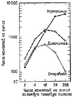 Аналогичный парадокс возникал перед исследователями функций гипоталамуса. Выше уже отмечалось, что, когда разрушения производились в области вентромедиального ядра гипоталамуса, оперированные крысы ели значительно больше контрольных и толстели. Но это еще не все. Хотя крысы с таким повреждением гипоталамуса ели больше, когда еда была вполне доступной, они в меньшей степени активно искали пищу, когда появлялись какие-либо препятствия (Miller, Bailey and Stevenson, 1950; см. также рис. Х-7). Было также обнаружено, что, чем вкуснее еда, тем больше ее съедают оперированные животные (Teitelbaum, 1955). Это наводит на мысль, что у оперированных животных больше не «влечение» к еде, а они более «разборчивы», нежели контрольные крысы. Результаты экспериментов, проведенных Кресном (1962) и Гроссманом (1966), усугубили парадокс: электрическое раздражение вентромедиального ядра вызывает прекращение поглощения пищи и воды у голодных крыс, а химическое раздражение холинэргического механизма вызывает топанье ногами (у песчанок, личное сообщение Глик-мана) и агрессивность, если животное рассердить (King and Hoe-bel, 1968). Гроссман коротко обобщил эти результаты в следующем утверждении: медиальный гипоталамус управляет изменениями висцеральных ощущений, а не потребностей. Но здесь мы снова сталкиваемся с нашей прежней дилеммой. Если медиальный гипоталамический механизм не связан с мотивацией, как же в таком случае возникает потребность в еде, питье и т. д.? Ответ на этот вопрос дают эксперименты. Вентромедиальная и латеральная гипоталамические области составляют две части одной" системы: латеральная часть является механизмом, «запускающим» питание (удаление ее ведет у крыс к голоданию), а медиальная часть является тормозящим механизмом (рис. Х-8). Парадокс разрешается, если предположить, что процессы, которые выключают организм из активного состояния, также генерируют соответствующие ощущения. Таким образом, становится яснее важнейшее различие между мотивацией и эмоцией: термин «мотивация» можно относить только к потребностям, «запускающим» процессам (тем, которые объединяются в латеральной гипоталамической области), а термин «эмоция» – к действию аффективных, «останавливающих» или насыщающих процессов, восстанавливающих равновесие. ![]()