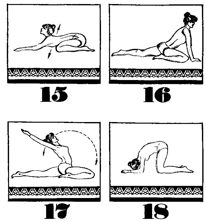 Эффект. Упражнение нормализует циркуляцию энергии и крови в области шеи, спины, боковых участков тела. Усиливается приток крови к самым труднодоступным участкам печени, селезенки и легких. Облегчает рассасывание спаек в результате воспаления легких. Укрепляет мышцы спины, боковых участков корпуса, шеи. Показания. Упражнение показано всем, кто умеет контролировать свои движения и степень напряжения мышц. Особенности выполнения. Особое внимание следует уделять моменту разглядывания своих пяток, не разрешая себе перенапрягать мышцы и шеи и корпуса. УПРАЖНЕНИЕ № 11. СИДЯ НА ПОЛУ (рис. 15) Порядок выполнения. Сесть себе на пятки, наклонить корпус вперед, вытянув вперед руки и касаясь подбородком пола. На глубоком вдохе отвести голову назад, задержать хорошо дыхание и произвести 2—6 покачиваний верхней частью корпуса и головой. Сделайте выдох усилием мышц живота. Повторите упражнение 1—3 раза. Эффект. Упражнение активизирует деятельность щитовидной железы. Укрепляет мышцы шеи, затылка, плечевые суставы, вызывает приток крови к этим областям. Способствует излечению плечевых суставов от ревматизма. Показание. Упражнение показано всем, кому оно подходит. Особенности выполнения. Необходим контроль за отклонением головы назад. УПРАЖНЕНИЕ № 12. СИДЯ НА ПОЛУ (рис. 16, 17) Порядок выполнения. Сесть на пол на одну ногу, вытянув другую назад и упереться выпрямленными напряженными руками в пол. На вдохе поднять руки вверх и прогнуться хорошо в пояснице. Задержать дыхание в таком положении и сделать 2—6 покачиваний головой и корпусом вперед-назад. На сильном выдохе опустить руки вниз до пола. Сменить ноги и повторить упражнение. Повторите упражнение I—3 раза. Эффект. Упражнение активизирует циркуляцию энергии в области спины. Является профилактическим при боли в спине. Укрепляет суставы позвоночника и мышцы спины и таза. Показания. Показано всем, кто может осторожно отклоняться назад, контролировать напряжение в межпозвонковых сочленениях. Особенности выполнения. Уметь расположить центр тяжести и найти опору ногами. Стараться, чтобы руки являлись продолжением корпуса при движении назад. Контролировать вдох, задержку и выдох. УПРАЖНЕНИЕ № 13. СТОЯ В КОЛЕНО-ЛОКТЕВОЙ ПОЗЕ (рис. 18) Порядок выполнения. Встать в колено-локтевую позу, касаясь лбом пола. После вдоха задержать дыхание и сделать 2—6 покачиваний тазом из стороны в сторону. Выдохнуть, напрягая мышцы живота. Повторите упражнение 5—10 раз. Эффект. Поза создает условия для снятия напряжения в межпозвоночных сочленениях. Предохраняет и оберегает от грыжи, геморроя. Стимулирует приток крови к голове. Эффективно при нервном истощении, т. к. стимулируется центральная нервная система. Желательно делать упражнение для обработки полного дыхания. Особенности выполнения. В этой позе надо научиться полному расслаблению мышц живота и практиковать ее как можно чаще для отдыха. Не надо испытывать страха перед этой позой, а чаще выполнять для отработки полного дыхания. В этой позе можно немножко и подремать, учась контролировать равновесие. |