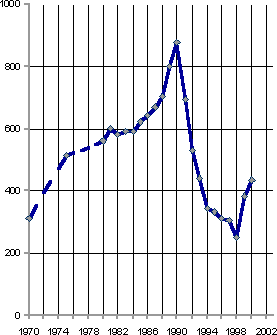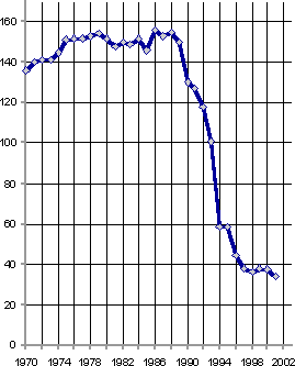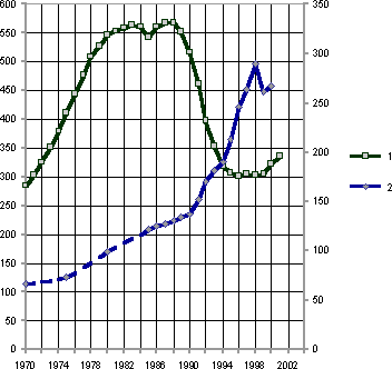 Раздел 4 Промышленность и строительство Источники: В 1930-е годы, в ходе нового этапа индустриализации, Россия (РСФСР) превратилась в промышленно-аграрную страну. Промышленное развитие продолжалось до конца 80-х годов. Этот процесс на последней стадии представлен на рис. 4–1. Рис. 4–1. Объем производства промышленной продукции в РСФСР и РФ (в сопоставимых ценах, 1980 = 100) Надо напомнить, что процесс индустриализации начиная с 30-х годов был исключительно интенсивным. Объем продукции промышленности в РСФСР к 1940 г. вырос по сравнению с 1913 г. в 8,7 раз. После войны страна вступила в новый этап индустриального развития, и к 1980 г. объем промышленного производства был в 161 раз больше, чем в 1913 г. Этот рост продолжался в стабильном темпе вплоть до 1990 г., когда вступили в действие законы, отменяющие принципы плановой экономики. Реформа означала, прежде всего, приватизацию промышленных предприятий — к 1997 г. негосударственные предприятия составляли 95,6 % общего числа предприятий и давали 89,6 % продукции. В наименьшей степени была приватизирована электроэнергетика (61,5 % ее предприятий в 1997 г. были негосударственными). Вторым важным изменением было расчленение крупных государственных фабрик, заводов и комбинатов. В 1990 г. в РСФСР имелось 26,9 тыс. промышленных предприятий с 23,1 млн. человек промышленно-производственного персонала, в 1997 г. 159 тыс. предприятий с 14,0 млн. человек персонала. Рассмотрим динамику изменения объемов производства в главных отраслях промышленности. Энергетика Производство энергии является фундаментом индустриальной цивилизации и условием существования современной материальной культуры. Возможность извлечения солнечной энергии, накопленной в виде угля и нефти, и превращения ее в механическую работу стала одним из главных факторов промышленной революции. Новым скачком в развитии индустриального типа производства и жизнеустройства стала технология превращения разных видов энергии в электрическую, удобную в распределении и использовании с высокой интенсивностью. Состояние электроэнергетики в большой степени предопределяет уровень и эффективность народного хозяйства любой страны. В 1917 г. производство электроэнергии в Российской империи составляло 2,2 млрд. квт-часов, и именно создание сети электростанций стало ядром первой большой комплексной программы модернизации народного хозяйства страны — ГОЭЛРО. Первый цикл индустриализации был проведен на энергетической базе с производством в РСФСР 30,8 млрд. квт-часов (1940 г.). В 1960 г. уровень производства был поднят до 197 млрд. квт-часов, после чего происходил быстрый и непрерывный рост. В 1960–1970 гг. была проведена централизация производства электроэнергии (в 1970 г. до 95,1 %), что резко повысило экономичность и эффективность отрасли. Удельный расход условного топлива на один отпущенный квт-час электроэнергии снизился с 468 г в 1960 г. до 355 г в 1970 г., а с 1980 г. стабилизировался на уровне 312–314 г. Это хороший показатель, не хуже, чем в других развитых странах. В 1985 г. он был равен в РСФСР 312 г, в США 357, Великобритании 340, Франции 357, ФРГ 327 и Японии 324 г. Наилучший результат в РФ был достигнут в 1993 г. — расход 308 г. условного топлива на один отпущенный квт-час электроэнергии (в 1996 г. была изменена методология определения этого показателя, и ряд прервался). Советский тип хозяйства позволил соединить электростанц