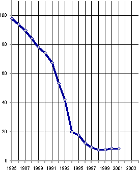 Но инвестиций не получают и самые прибыльные отрасли промышленности. Возьмем одну только отрасль — энергетику. Вот выпуск «Обозрений» («Центр развития») от 13 ноября 2000 г.: «В этом году потребность в инвестициях в газовую промышленность (по экспертной оценке, около 3,5–4 млрд. долл.) может опередить их фактический объем более чем в 2,5–3 раза… Недавнее приобретение ЛУКойлом 1300 АЗС в США, его же более ранние покупки НПЗ в Румынии, Болгарии и на Украине, а также относительно успешная попытка Газпрома закрепиться на венгерском рынке говорят о том, что среди российских сырьевых экспортеров преобладает стратегия вложения во внешние активы». Выпуск «Обозрений» от 15 января 2001 г. гласит: «В ближайшие десять лет, по оценкам экспертов, выбытие мощностей в течение 2000–2010 гг. возрастет примерно до 10 млн. кВт в год, а существующие темпы ввода новых мощностей уже не будут покрывать их выбытия. В среднем за предшествующие 10 лет вводились мощности около 1,24 млн. кВт в год, в 1999 г. объем ввода новых мощностей составил, по словам зампреда правления РАО «ЕЭС России» Я. Уринсона, лишь 0,84 млн. кВт, в 2000 г. был введен 1 млн. кВт… По оценкам экспертов, потребность в инвестициях в электроэнергетику в 2001–05 гг. будет составлять от 3,8 до 4,4 млрд. долл. в год, а в 2006–10 гг. возрастет до 8,4–9 млрд. долл. в год, тогда как объем инвестиций в основной капитал снизился с 4,9 млрд. долл. в 1997 г. до 1,1 млрд. долл. в 1999 г., а в 2000 г. может составить лишь 1,3–1,5 млрд. долл.». Таким образом, к концу 2001 г. промышленность вышла на уровень 1994 г. — и при этом подъем закончился, а после октября 2000 г. даже произошло снижение показателя. Подъем производства в самые последние годы лишь вернул промышленность к «дну» того спада, который произошел в первые три года реформы. Надо помнить при этом, что уровень промышленного производства в 1993 г. составил всего лишь 64,9 % от уровня 1990 г. Примерно такова же динамика вычисляемого Центром экономической конъюнктуры при правительстве РФ индикатора «качества» структуры промышленного производства. Этот показатель дает представление о соотношении в общем объеме промышленного производства продукции отраслей добычи сырья и отраслей высокой степени переработки. В ходе реформы экономика РФ получила гипертрофированную экспортно-сырьевую ориентацию, и индикатор «качества» резко упал, достигнув своего минимума в августе 1998 г. После этого положение выправилось до уровня 1995 г., а в ноябре-декабре 2001 г. опять слегка сдвинулось к сырьевой ориентации. Развитие промышленности, особенно ее наукоемких отраслей, зависит не только от инвестиций и обновления основных фондов (прежде всего, машин и оборудования), но и от состояния отечественного научно-технического потенциала. Речь идет о потенциале как целостной системе, включающей в себя проведение научно-исследовательских и опытно-конструкторских разработок (НИОКР), опытное производство, внедрение новых продуктов и технологических процессов в массовое производство, подготовку соответствующих новым технологиям кадров и т. д. Вся эта деятельность составляет особый «срез» общества, в котором взаимодействует политика, экономика, культура. Что произошло с научно-технической сферой России в результате реформы? Даже если не рассматривать такие важные для этой сферы, но неуловимые признаки ее состояния, как престиж научно-технич