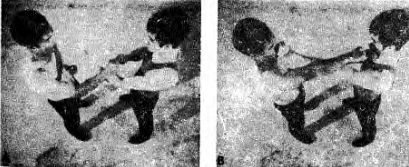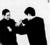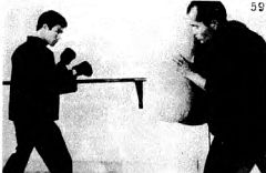 Глава 7. Искусство удара ногами Искусство удара рукой заключается не только в ударе и поражении цели. Точность, скорость и сила удара — только часть техники удара рукой. Другими элементами являются: положение тела в момент нанесения удара, путь, который проходит кулак до цели, и, наконец, способ нанесения удара. В ДКД чаще всего употребляется и является самым важным ударом удар кулаком ведущей рукой. Это быстрый удар, который проходит очень короткое расстояние до цели; это точный удар, выполняемый прямо вперед; осуществляется с минимальным усилием и благодаря этому не нарушает вашего равновесия. Удар кулаком ведущей рукой наносится из положения защиты и путь движения кулака к цели должен представлять прямую линию перед вашим носом, как показано на фотографиях 41, 42, 43. Нос должен вам служить точкой ориентира. Одним из самых больших преимуществ этого удара является то, что его можно выполнять и при этом хорошо защищать тело от контрудара. Ваше тело хорошо защищено и вы находитесь в отличной позиции, чтобы соориентироваться при промахе. Сравните с классическим китайским боксом, где удар кулаком начинается от боков, и большая часть тела открыта. Вы можете это видеть на фотографиях А, В и С. Когда удар закончен, то одна из сторон корпуса тела, и особенно лицо, остаются открытыми, как только вы прижимаете руку к боку (посмотрите на фотографию С). На следующей серии фотографий (1–4) вы заметите разницу в выполнении удара в джит кун до и классическом китайском боксе. В ДКД, как показано на фотографии 1, руки защищают лицо и обе стороны тела. На этой же самой фотографии борец классического стиля защищает только правую сторону тела. Фото 1 На фотографиях 2 и 3 борец стиля ДКД уже нанес удар, в то время, как удар борца классического стиля все еще находится в пути. Фото 2 Фото 3 На фотографии 4 показано, как завершаются удары в том и другом стиле. Фото 4 На фотографии А Ли демонстрирует, какое краткое расстояние преодолевает его удар, выполненный из положения защиты, в отличие от удара, выполненного в стиле классического китайского бокса. Понятно, по какой причине его удар достигает цели намного быстрее, нежели удар в классическом стиле китайского бокса (посмотрите на фотографии 2 и 3). Выполнение удара кулаком, расположенным вертикально, вместо горизонтального положения, как в классическом китайском боксе (эти позиции вы можете видеть на фотографии 44), придает ему дополнительную досягаемость. Еще яснее это показано на фотографиях А и В. Удар Ли, снятый с высоты птичьего полета (фотография В), достигает лица противника, но полностью вытянутая рука противника не поражает голову. Ли. Преимуществом этого удара в стиле джит кун до является большая досягаемость (десять и более сантиметров) по сравнению с ударом в классическом стиле. Оба удара кулаком в стиле джит кун до: короткий удар ведущей рукой, показанный на фотографии Х, и длинный — на средней дистанции. На фотографии X Ли показывает, насколько удлиняется удар, демонстрируемый на фотографии У. Рука, которая остается позади, служит для защиты и должна находиться достаточно высоко, чтобы защитить верхнюю часть тела от контрнападения. Эта рука является также дополнением ведущей руки. Обе они препятствуют движению рук противника, чтобы он не смог выполнить контрнападение. Рука, которая позади, всегда должна