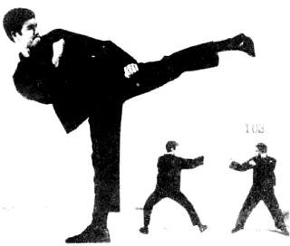 Глава 14. Нападение ногами Во время нападения наилучшими являются быстрые удары ногами. Удар ногой необходимо выполнить прежде, чем противник сможет подготовиться к защите или уклониться от удара. Вы должны следить, чтобы противник не использовал ваш удар ногой. Поэтому научитесь выполнять резкие и сильные удары ногой. Во время тренировки обращайте внимание не только на выполнение удара, но и на отвод ноги после удара. Удары выполняйте рывком от колена, чтобы они были сильнее, и комбинируйте боковой замах и замах колена, чтобы достичь большей скорости. Научитесь контролировать свое тело, чтобы вы могли наносить удары из прямого положения или согнувшись, от земли и пока вы находитесь в движении: наступая, отступая, двигаясь влево или вправо. Удар ведущей ногой, в колено и, голень Для опытного борца естественна зависимость от ударов ногами в начале нападения. Нога сильнее и длиннее руки. В джит кун до в начале борьбы чаще всего употребляется низкий удар ногой в сторону, направленный в колено или голень. Удар ногой является резким ударом, т. к. выполняется с помощью толчка или рывка и может повредить колено противника. Борец, хорошо владеющий техническими приемами, связывает их в комбинацию для более успешного нападения. Но даже если удар ногой оказался не эффективным, он лишит храбрости противника, который не сможет взять инициативу и будет держаться от вас на расстоянии. Против борца, находящегося в таком положении, как показано на фотографии 76, Рис. 76 Ли так поднимает ведущую руку, чтобы смутить противника (посмотрите на фотографию 77), и быстро движется вперед, чтобы нанести низкий удар ногой в колено, опрокидывая этим противника на землю, прижимая и далее ногой колено, как видно на фотографии 78. Посмотрите, как далеко стоит Ли от своего противника в момент выполнения удара (фотография 78). Против борца, стоящего в противоположном положении, как показано на фотографии 79, Ли использует точно такое же начало нападения, т. е. поднимает руку, как видно на фотографии 80, и быстро выполняет удар в сторону, но на этот раз в левое колено противника, как показано на фотографии 81. Обратите внимание на взгляд Брюса Ли. Он не смотрит на цель, но в лицо противника. Он делает это для того, чтобы скрыть свои намерения и этим обескуражить противника. Удар в сторону ведущей ногой Удар ногой в сторону является самым сильным ударом в джит кун до. Этот удар настолько силен, что даже блокадой противник не может помешать этому удару опрокинуть его на землю. Удар выполняется на среднем расстоянии, увеличивая этим замах, прежде чем удар коснется цели. Против борца, стоящего в таком положении, как показано на фотографии 82, Ли поднимает руку, находясь на средней дистанции от противника, как видно на фотографии 83. Вторую руку он держит внизу, как бы защищаясь от возможного контрудара ногой. Он быстро наносит удар ногой в сторону в ребра противника, как видно на фотографии 84, бросая его назад, как видно на фотографии 85. Хотя удар очень силен, трудно победить противника, если он опытен в защите. Защититься от этого удара можно, либо отступив на достаточное, чтобы избежать удара, расстояние, либо отойти в сторону, чтобы удар прошел рядом с вами. Удар можно и заблокировать, схватив ногу противника, наносящую удар. Против борца, находящегося в положении, показанном на фотограф