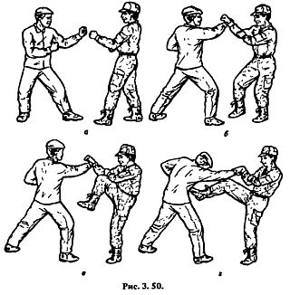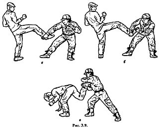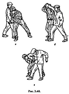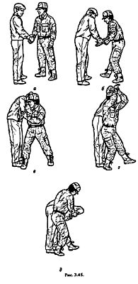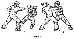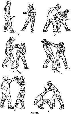 Глава 3. Тактика ведения рукопашного боя Особенности самообороны при прямолинейном способе ведения бояПриемы, описанные в этом комплексе, основываются на прямолинейном базовом перемещении и применяются обычно в тех случаях, когда приходится вести борьбу в узком, ограниченном с двух сторон пространстве, где нет возможности уйти в сторону с линии атаки (узкий коридор, препятствия сбоку и т. п.). Защита автоматом от атаки штыковым оружием (рис. 3.1). Противник изготовился к бою (рис. 3.1а) и атакует с выпадом вперед. Защищающийся с уходом в левостороннюю заднюю стойку отбивает стволом автомата штыковое оружие противника (рис. 3, 1б). Далее с быстрым подшагом вперед наносится удар прикладом по пальцам левой руки противника в месте захвата им цевья автомата. Автомат держится таким образом, чтобы защитить голову от возможной контратаки противника (рис. 3.1в). При продолжении подшага наносится удар прикладом снизу вверх в голову противника (рис. 3.1 г). Если противник не выпустил оружия из левой руки (рис. 3.1д), то движением в заднюю стойку защищающийся выполняет болевое воздействие на левую кисть противника, зажатую между правой рукой защищающегося и прикладом автомата, с одновременной атакой магазином автомата в голову (рис. З.1е). Защита автоматом от удара ножом сверху (рис. 3.2). Противник атакует ножом сверху (рис. 3.2а). С уходом назад в левостороннюю заднюю стойку защищающийся отводит стволом автомата слева направо атакующую руку противника (рис. 3.2б). Далее с переходом в левостороннюю переднюю стойку осуществляется атака магазином автомата в корпус атакующего (рис. 3.2в). При этом ствол автомата направляется под правое плечо атакующего для того, чтобы потом провести загиб правой руки противника за спину. Загиб выполняется за счет поворота автомата вокруг этой руки (рис. 3.2 г). Болевое воздействие усиливается при подшаге правой ногой вперед (рис. 3.2д). Защита автоматом от удара ножом снизу (рис. 3.3). Противник атакует ножом снизу (рис. 3.3а). Одновременно с уходом в левостороннюю заднюю стойку защищающийся отбивает прикладом автомата атакующую руку противника (рис. 3.3б). Блок выполняется движением автомата справа налево. Затем следует резкий переход в правостороннюю переднюю стойку и атака прикладом в корпус противника или удар в область плечевого сустава (рис. 3.3в) с последующим загибом руки за спину за счет ухода в заднюю стойку (рис. 3.3 г). Обезоруживание противника, вооруженного пистолетом (рис. 3.4). Противник угрожает выставленным вперед пистолетом (рис. З.4а). Из левосторонней задней стойки защищающийся быстро переходит в переднюю стойку. Поскольку масса тела при этом переносится на левую ногу, правая нога освобождается для удара, который наносится сбоку вверх по кривой внутренним рантом обуви по кисти противника, держащей пистолет (рис. 3.4б). После удара по руке защищающийся этой же ногой совершает удар в колено, выполняя винтообразное движение, усиливая его разворотом бедер (рис. 3.4в). Это движение валит противника на землю. Варианты окончания приема показаны на рис. 3.4 г,д. Обезоруживание противника при ударе ножом снизу (рис. 3.5). При ударе ножом снизу (рис. 3.5а) защищающийся уходит в правостороннюю заднюю стойку, увеличивая дистанцию. При этом он правой рукой блокирует атакующую руку противника, а левой рукой закрывает грудь (рис. 3.5б). С переходом в п