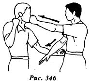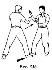 Техника защиты Умение защищаться является важнейшей составляющей боевого искусства. Вин Чунь не является исключением. В этом стиле практически нет приемов пассивной защиты. За редким исключением, технические действия в обороне построены таким образом, чтобы одновременно с нейтрализацией атаки противника проводить свою контратаку. Таким образом, реализуется принцип: «Одновременно использовать обе руки». Такой подход к защите повышает эффективность ведения поединка, поскольку проводя атаку, противник изменяет свою позицию и оказывается в состоянии несбалансированной защиты. Этот момент и должен использоваться. Защита, проводимая с одновременной контратакой, является наиболее эффективной тактикой, используемой в реальном поединке. В стиле Вин Чунь теория защиты предполагает рассмотрение человеческого тела, разделенного на воображаемые зоны. Всего таких зон четыре (рис.320). Для защиты каждой зоны разработан набор технических приемов. Боевая позиция (рис.321) наиболее приспособлена для проведения защитых и контратакующих действий. Обе руки могут использоваться как для нейтрализации атак противника, так и для проведения собственных контратак. ЗАЩИТА ЗОНЫ I Техника 1 Из исходного положения (рис.322), противник сокращая дистанцию посредством шага вперед, атакует прямым ударом правым кулаком в голову. Нейтрализуйте атаку левой рукой, выполняя блокирующее движение Пак Сау. Одновременно контратакуйте, нанося прямой удар левым кулаком Ят Чи Куен в голову (рис.323,324). Техника 2 Из исходного положения (рис.325) противник, делая шаг вперед левой ногой, атакует, нанося круговой удар правой ногой в голову. Поворачивая корпус влево, нейтрализуйте атаку поднимая обе руки вверх в положение By Сау (рис.326). Выполнив защиту, моментально шагните правой ногой вперед и нанесите прямой удар левым кулаком в область печени. При этом необходимо контролировать правую руку противника, прижимая ее к туловищу правой ладонью в области плеча (рис.327). Техника 3 Из исходного положении (рис.328) противник сокращает дистанцию шагом впереди атакует боковым восходящим ударом правым кулаком в голову (рис.329). Рис. 329 Поворачиваясь налево, нейтрализуйте атаку левой рукой, выполняя движение Тан Сау. Одновременно контратакуйте, нанося прямой удар правым кулаком Ят Чи Куен в голову (рис.330). На рисунке 331 изображена аналогичная ситуация. Отличия заключаются в расположении защищающегося по отношению к нападающему. В данном случае, защищаясь, вы располагаетесь с внешней стороны от атакующей руки противника, что более безопасно, так как ему довольно трудно продолжить атаку другой рукой. Техника 4 Из исходного положения (рис.332) противник делает шаг левой ногой, сокращая дистанцию и атакует, нанося прямой удар правым кулаком в голову (рис.333). Сделайте небольшой шаг правой ногой вправо-вперед, уходя с линии атаки и повернитесь налево. Левой рукой выполните блокирующее движение By Сау, нейтрализуя атаку. Одновременно контратакуйте, нанося прямой удар правым кулаком Ят Чи Куен в голову (рис.334). Обратите внимание на точную скоординированность движений рук и всего тела. ЗАЩИТА ЗОНЫ II Техника I Из исходного положения (рис.335) противник сокращает дистанцию и атакует прямым ударом левым кулаком в голову (рис.336). Нейтрализуйте атаку правой рукой, выполняя блокирующее движение Тан Сау. Од