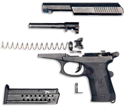 Самозарядный пистолет Сердюкова - СПС Тактико-технические характеристики СПС Калибр…9 мм Патрон…9x21 Масса оружия без патронов…0,9 кг Длина оружия… 200 мм Длина ствола…120 мм Начальная скорость пули…410 (7Н29) м/с Боевая скорострельность…36 в./мин Прицельная дальность…100 м Емкость магазина…18 патронов ![]() Пистолет СПС и патроны 9x21 СП.10 (7Н29) ![]() ![]() Неполная разборка пистолета СПС Создание этого пистолета началось в рамках работ над армейским пистолетом по теме «Грач» и прошло несколько этапов. А.Б. Юрьевым и И.П. Касьяновым был разработан патрон РГ052 (9x21), под него в ЦНИИТОЧМАШ (г. Климовск) П.И. Сердюков и И.В. Беляев к 1993 г. отработали пистолет РГ055, известный также как «Гюрза». В 1996 г. появился доработанный СР.1 «Вектор» с патроном СП.10 (7Н21). Наконец, в 2003 г. Российская армия приняла на вооружение СПС («самозарядный пистолет Сердюкова», 6П53) и новые патроны: 7Н28 с малорикошетирующей пулей массой 7,9 г, 7Н29 с бронебойной пулей массой 6,7 г, 7БТЗ с бронебойно-трассирующей пулей массой 7,2 г. Пуля патрона 7Н29 надежно поражает цели в средствах индивидуальной бронезащиты, в автомобилях, на дальности 40 м пробивает 5-мм стальной лист. Автоматика пистолета действует на основе отдачи ствола с коротким ходом, запирание канала ствола - с помощью вертикально качающегося замыкателя. Ударно-спусковой механизм - курковый, с витой боевой пружиной, смонтированной в полости курка. Возможен выстрел с предварительным взведением курка или самовзводом. Есть два автоматических предохранителя. Первый - в виде клавиши позади рукоятки - выключается при полном охвате рукоятки ладонью. Второй представляет собой рычажок на спусковом крючке и выключается в начале спуска. Рамка - пластмассовая с металлическими вставками. Форма спусковой скобы рассчитана на стрельбу с двух рук. Прицельные приспособления снабжены белыми вставками. Магазин - двухрядный. Для ускорения перезаряжания пружина подавателя выталкивает магазин при нажатии на кнопку защелки, а останов затвора автоматически выключается при установке снаряженного магазина. |