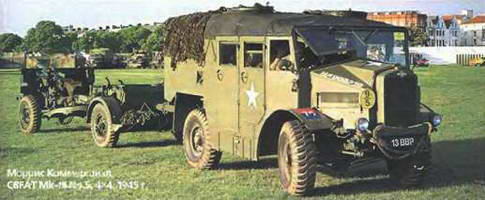 МОРРИС/ МОРРИС КОММЕРШИЭЛ (MORRIS/ MORRIS COMMERCIAL) Оксфорд/ Бирми нгем Великобритания 1926-1985 Английская компания «Моррис» из Оксфорда, созданная в 1913 г. известным изобретателем и предпринимателем Уильямом Моррисом (William Morris), первоначально изготовляла простые и дешевые легковые автомобили, а свою деятельность в военной области начала лишь с созданием в 1924 г. грузового отделения «Моррис Коммершиэл». Между тем головное предприятие «Моррис» являлось поставщиком штабных, разведывательных и санитарных машин, выполненных на серийных легковых шасси с упрощенными кузовами. Первым на вооружение в 1929 г. поступил известный микролитражный автомобиль «Моррис Минор» (Minor) с 850-кубовым мотором. Это был 2-местный спортивный вариант, применявшийся для доставки срочных депеш. За ним последовали модели «Минор», 8НР, 10НР и другие. Единственным специальным штабным автомобилем в 1937 г. стал «Моррис Уосп», выполненный на стандартном шасси 8НР с 4-цилиндровым мотором (918 см , 24 л.с), развивавший скорость 80 км/ч. Он получил 2-ступенчатый редуктор в трансмиссии, спицевые колеса с вездеходными шинами и высокий 2-дверный кузов с тентом. Моррис Уосп, 1937 г. Моррис-М 12НР «Тилли», 1940 г. Моррис Коммершиэл Т, 1926 г. Моррис Коммершиэл D, 6X4,1932 г. Моррис Коммершиэл D, 6X4,1927 г. В годы Второй мировой войны «Моррис» выпустил 8 тыс. штабных автомобилей и цельнометаллических пикапов 10НР серии М (4x2) с несущими кузовами, известных под прозвищем «Тилли» (Tilly). Их оснащали верхнеклапанным мотором (1,1 л, 37 л.с), шинами увеличенного размера и решеткой перед радиатором. Не менее известным в то время стал простой пикап «Моррис Y», применявшийся как легкая санитарная машина. Работы над специальными армейскими автомобилями начались вскоре после создания в мае 1924 г. отделения «Коммерческие автомобили Морриса» – «Моррис Коммершиэл Карз» (Morris Commercial Cars Ltd.), которое разместилось в Бирмингеме и выпускало их под маркой «Моррис Коммершиэл». Первыми в британскую армию с 1926 г. стали поступать стандартные 1-тонные 42-сильные грузовики и санитарные модели Т, выполненные на агрегатах легкового «Оксфорда» (Oxford). В конце 1926 г. фирма получила первый заказ военного ведомства на многоцелевые 1,5-тонные грузовики и седельны оборудовали 4-цилиндровым двигателем мощностью 50 л.с, задними неразрезными мостами на двух продольных рессорах, а в 1932 г. была изготовлена партия грузовиков и санитарных машин для британской армии в Индии. Они получили односкатные колеса с шинами низкого давления, а ход задней подвески возрос с 91 до 100 см. Штабные машины 6D снабжали 6-цилиндровым мотором (4,3 л, 74 л.с.) и достаточно элегантным 5-дверным цельнометаллическим кузовом. В 1933 г. развитием серии D стало 1,5-тонное семейство CD (6x4). Базовый грузовик оснащался 4-цилиндровым двигателем (3,5 л, 55 л.с), 5-ступенчатой коробкой передач, главными червячными передачами, гидроприводом тормозов, рессорной подвеской и односкатными 20-дюймовыми колесами. Через год на его базе стали собирать бескапотные машины CDF и CDFW с лебедкой, а в 1935-36 гг. выпустили 80 открытых штабных автомобилей. В 1935-42 гг. фирма изготовляла также легкий артиллерийский тягач и эвакуатор CD5W с 6-цилиндровым мотором (3,5 л, 60 л.с), открытой кабиной без дверей и коротким бортовым кузовом, 16-дюймовыми шинами и лебедкой с тяговым усилием 4 тс. Моррис Коммершиэл D, 6X4,1930 г. Моррис Коммершиэл CD, 6X4,1936 г. Моррис Коммершиэл C