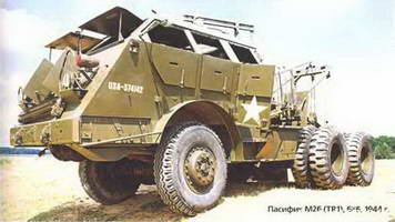 ПАСИФИК (PACIFIC) Рентой/Бель вью США 1942-1979 В1905 г. в штате Вашингтон образовалась фирма по производству вагонов и литья, получившая название «Тихоокеанская машиностроительная и металлургическая компания» – «Пасифик Кар энд Фаундри» (Pacific Car and Foundry Company) и со временем превратившаяся в крупнейший американский холдинг по производству тяжелых грузовиков. К выпуску военной автотехники в 1942 г. ее привлекло артиллерийское управление военного ведомства США, годом ранее разработавшее техническое задание на тяжелый бронированный тягач. В 1942 г. его спроектировала и построила фирма «Накки» (Knuckey), но производственными мощностями для их изготовления она не располагала. Так в марте 1943 г. компания «Пасифик» начала выпуск наиболее крупного армейского автомобиля Второй мировой войны – бронированного 12-тонного танкового седельного тягача М26 (6х6) с заводским индексом TR1. Пасифик М26 (TR1), 6х6,1944 г. Танковый автопоезд «Пасифик М25», 1943 г. Пасифик М26А1, 6х6,1945 г. Пасифик М26 (TR1), 6х6,1944 г. Его главной внешней особенностью была вынесенная вперед удлиненная 7-местная кабина с наклонными стальными бронелистами и откидными щитками во всех оконных проемах и на передней панели перед радиатором. В задней части крыши имелся люк, открывавший доступ к зенитному пулемету на поворотной турели. Среди оригинальных конструктивных решений были рядный 6-цилиндровый верхнеклапанный бензиновый двигатель (17,9 л, 240 л.с.) компании «Холл-Скотт» (Hall-Scott), установленный в передней части кабины, механическая 4-ступенчатая коробка передач с дополнительным 3-ступенчатым редуктором и одноступенчатой раздаточной, а также задняя ведущая тележка на балансирной подвеске с индивидуальным цепным приводом каждого моста. Тягач оснащался пневматическим тормозным приводом, шинами размером 14.00x24, двумя лебедками с тяговым усилием по 20 т, расположенными за кабиной, и одной передней 16-тонной. Для перевозки танков и артиллерийских орудий он работал в сцепе с 2-осным низкорамным 40-тонным полуприцепом М15 фирмы «Фрюхауф» (Fruehauf). Этот 19-метровый автопоезд полной массой 93,3 т имел собственное обозначение М25 и неофициальное название «Дрэгон Вэгон» (Dragon Wagon). При полной нагрузке он мог двигаться по шоссе со скоростью 45 км/ч. В варианте ремонтно-эвакуационной машины тягач дополнительно оснащали П-образной подъемной балкой, механическим краном и сварочным оборудованием. С мая 1944 г. фирма изготовляла облегченный небронированный тягач М26А1 с округлой открытой кабиной и пулеметной турелью. Его массу удалось снизить сразу на 10 т – с 22,2 до 12,5 т. Вариант М26А2 отличался 24-вольтовым электрооборудованием. До начала 1945 г. компания «Пасифик» построила 1272 тягача, в том числе 752 модели М26. Одновременно она собирала танки М4 «Шерман» (Sherman). Прочное финансовое положение компании «Пасифик Кар энд Фаундри» позволило ей в послевоенное время начать активное присоединение американских изготовителей грузовых автомобилей, а в 1972 г. она превратилась в холдинг «Паккар» (Paccar). Пасифик ХМ977, 8х8,1978 г. К настоящему времени в него входят такие известные фирмы, как «Кенуорт» (Kenworth), «Питербилт» (Peterbilt), «Фоден» (Foden), «Лейланд» (Leyland) и ДАФ (DAF), обеспечивающие «Паккару» лидирующее положение в выпуске тяжелых грузовиков. Практически полностью перестроившись на производство коммерческих автомобилей, некоторое время компания «Пасифик» продолжа