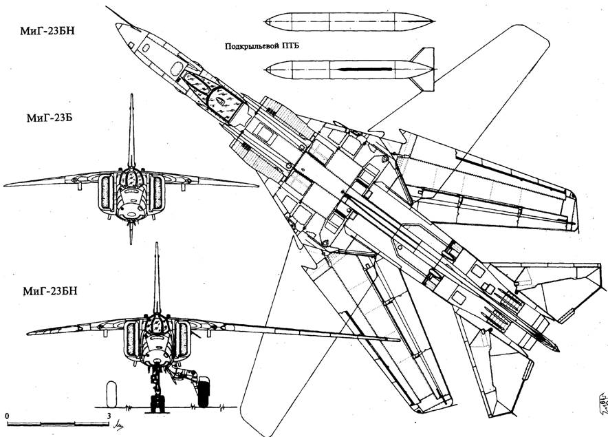 ТЯЖЕЛЫЙ СТРЕСС КОТА МАРТЫНА Миг-27: Страницы биографии Владимир Ильин ![]() МиГ-23Б В Липецке у меня жил кот по имени Мартын - пушистое ленивое и очень симпатичное создание благородных персидских кровей. Летом все свободное от сна и поглощения жареной рыбы и вареных раков время он проводил на балконе, наблюдая с седьмого этажа за насыщенной событиями жизнью двора. Заходящие на посадку прямо над домом, самолеты его мало беспокоили: заслышав легкий свист работавших на малом газу турбин, он лишь довольно щурился. Но однажды его состояние блаженства было беспощадно и грубо нарушено: поднявшаяся по тревоге пара Ми Г-27 выскочила, как чертик из коробочки, из-за крыш ближайших домов, неистово гремя тур-биналш, прошалаеь над балконом и стремительно растворилась в утреннем небе, оставив за собой лишь гвалт обезумевших ворон и испуганный лай собак. Мартын пережил тяжелый стресс, более глубокий, чем явление работающего пылесоса. Вскоре кошмарвабылся, однако МиГ-27 напомнил о себе через несколько месяцев самым неожиданным образом: друзья-моделисты Валентин Копылов и Володя Гуденко подарили мне на день рождения модель МиГа. Великолепная игрушка из дерева и пластика имела все атрибуты настоящего истребителя-бомбардировщика- поворотное крыло, действующую мсханизагаоо, складываюиашеяподфюзеляж-ный гребень и дажЪ открываемую крышку фонаря. Естественно, я показал подарок Мартыну. Самолет в гюсадочной конфигурагиш не произвел на зверя ни малейшего впечатления, он лишь лениво моргнул: мол, видали мы таких… Од›ш-ко когда я, без всякой задней мысли, переложил крыло на лшк-симальный угол стреловидности и откинул гребень, реак-цияпоследовала мгновенно. Узнав своего давнего «врага»,кот взвыл мерзким голосол‹и метнулся под диван. Сначала я справедливо отнес «успех» демонстрации на счет высокого качества модели, однако потом все же решил провести биопсихологический эксперимент. Взяв у Валентина «на прокат»модели МиГ-21 и Су-17, я гюдразными ракурсами крутил их перед носом Мартына, однако умное животное оставалось совершенно равнодушным. Но стоило мне вновь показать ему МиГ-27 со сложенным крылом, как кот. тут же позорно бежал. ![]() МиГ-23БН Ив самом деле, хищный образ истребителя-бомбардировщика МиГ-27, стремительно мчащегося над землей, незабываем! И он вселял ужас не только в трепетные души липецких котов. Известно, что после того, как южно-африканские войска в конце 1980 годов под ударами кубинцев вынуждены были оставить один из населенных пунктов юга Анголы, на стене полуразрушенного здания была обнаружена красноречивая надпись, сделанная «бурами»: «Эти МиГи ударили нас в самое сердце!» Похвала достойного противника - лучшая оценка труда создателей оружия! Потребность в новой легкой ударной машине для советских ВВС возникла во второй половине 1960 годов, когда военное и политическое руководство страны вынуждено было сделать вывод о том, что, помимо всеобщей ракетно-ядерной войны с США, СССР угрожают и локальные конфликты с применением обычного оружия. Кроме того, по изменившимся взглядам, «большая» война в Европе могла протекать и без использования атомных бомб. Однако, как оказалось, в составе фронтовой авиации отсутствует ударный самолет, соответствующий новым требованиям. Последние штурмовики Ил-ЮМ «тихо скончались», на аэродромных свалках где-т