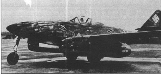 БОЕВАЯ КАРЬЕРА Me 262 7- Я ЭСКАДРАЭскадра JG-7 стала наиболее результативным соединением из всех подразделений, когда-либо использовавших Ме-262. За семь месяцев существования в Ягдгешвадер-7 было направлено истребителей Ме-262 и летчиков-реактивщиков больше, чем в любую другую. Эскадру сформировали в августе 1944 г. Планировалось, что в нее войдут две группы FW 190 с местом дислокации в Кенигсберге. Нехватка летчиков и самолетов не позволила выполнить план, поэтому было решено вооружить обе группы самолетами Bf 109G- 14. Теперь местом базирования II группы определялся аэродром Зигенхайн в Чехословакии. Однако, штабы вновь столкнулись с нехваткой личного состава и самолетов. Формирование ягдгешвадера, вооруженного Bf 109G-14, также осталось лишь на бумаге. На фоне всех этих передряг, назначение командиром эскадры получил полковник Йоханнес Штейнхофф. Между тем планы командования люфтваффе в отношении формируемой эскадры изменились кардинально. Согласно последнему плану в состав JG-7 должны были войти не две, а три группы, а вооружить штаффели ягдгешвадера предстояло реактивными Ме-262. После войны Штейнхофф так вспоминал начало формирования первого в мире соединения реактивных истребителей осенью 1944 г.: – Начали прибывать первые самолеты. Их привозили в больших железнодорожных контейнерах, разобранными на части. Наши механики вместе с представителями фирмы Мессершмитт собирали истребители и опробовали их вооружение. В конце ноября мы уже летали, отрабатывая полеты в составе пары и тройки. После шести недель тренировочных полетов в районе Бранденбург-Брест Штейнхофф доложил о достижении эскадрой состояния боеготовности. Новые самолеты, проблемы с поставкой специфических запасных частей, прибытие новых летчиков – все это мешало Штейнхоффу сколотить по-настоящему спаянный боевой коллектив. Слабое тактическое взаимодействие так и оставалось ахиллесовой пятой эскадры до конца войны. Первой боеспособной группой эскадры стала III/JG 7 под командованием майора Эриха Хохагена, которую перевели в Парчим под Швериным. Ядром III./JG-7 стала "Коммандо Новотны". Перед летчиками III./JG-7 поставили задачу разработать тактику боевого применения Ме-262 для остальных групп 7-й эскадры. Предлагаемые методы использования преимуществ реактивных истребителей при атаке четырехмоторных бомбардировщиков вызвали оживленные дебаты. Датой формирования III./JG-7 считается 19 ноября 1944 г. Летчиков в III./ JG-7 отбирали из "Коммандо Новотны", JG-54, JG-3 "Удет" и KG-1 "Гинден- бург". Местом базирования группы был определен аэродром Лагер-Лакфельд. Штейнхофф так вспоминал о дискуссиях в отношении тактики боевого применения и месте Ме-262 в системе обороны Рейха от налетов бомбардировочной авиации союзников: – Мы разработали несколько методов наилучшего использования Ме-262 против строя бомбардировщиков, но так и не пришли к единому мнению. В конечном итоге мы вернулись к признанию старой общеизвестной тактики: атака сзади сверху, пролет через заградительный огонь стрелков и открытие огня из бортового оружия с предельно малой дистанции. Ме-262 был строгим в пилотировании и весьма уязвимым самолетом, наши потери оказались выше, чем мы ожидали. Во второй неделе ноября группа офицеров JG-7 прибыла на аэродром Лагер- Лекфельд, расположенный в самом сердце Баварии. Личный состав эскадры был очень оп