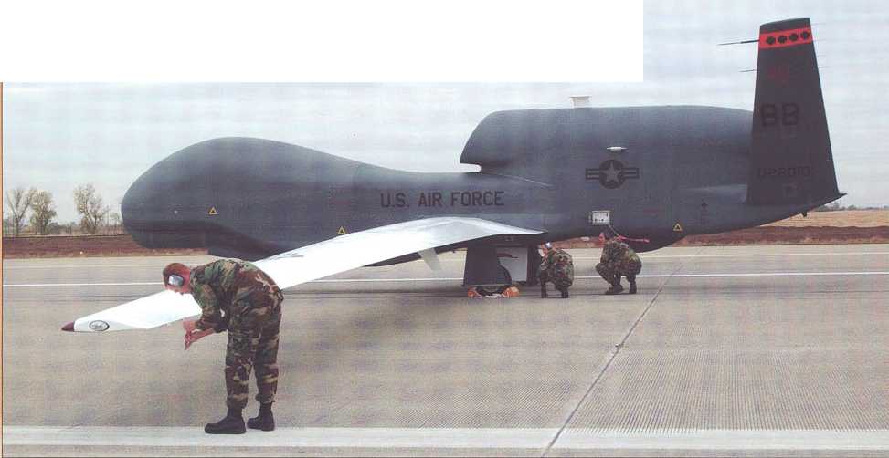 Всевидящее око «Глоубал хоука» После затянувшегося перерыва продолжим рассказ о зарубежных беспилотных летательных аппаратах (БПЛА). В предыдущей статье (см. журнал «АиК» No 1/2005 г.) мы представили семейство наиболее популярного оперативно-тактического многоцелевого БПЛА RQ/ MQ-1 «Предейтор», выпускаемого достаточно крупными партиями авиационным отделением GA-ASI американской корпорации «Дженерал Атомикс». На этот раз речь пойдет о другом, не менее известном американском беспилотном аппарате Нортроп Грумман RQ-4 «Глоубол Хоук», являющимся самым крупным в мире. По сути дела, это самый настоящий беспилотный самолет с размахом крыла свыше 35 м и взлетной массой более 11 т. «Глоубол Хоук» относится к классу БПЛА, способных совершать длительные полеты (более 30 ч) на высотах 18000-19000 м и без посадки преодолевать расстояния до 21000 км. Не случайно аппарат носит название «Глоубол Хоук», что в переводе означает «Глобальный Ястреб». Этим подчеркивается его способность долгое время «парить» над удаленной местностью, высматривая с помощью зорких опто- электронных «глаз» различные объекты, зачастую достаточно мелкие. БПЛА представляет собой сложнейший и высокоэффективный авиационный беспилотный информационный комплекс, состоящий на вооружении ВВС США и способный в масштабе реального времени передавать необходимые сведения, помогающие решению стратегических задач. «Глоубол Хоук» вобрал в себя результаты почти 40-летних усилий американских специалистов, занятых в области создания разведывательных БПЛА. И прежде чем начать о нем наше повествование, окунемся немного в историю. Хорошо известно, что для выполнения длительных высотных разведывательных полетов в США в 1950- х годах фирмой «Локхид» был разработан самолет U-2. В течение ряда лет эти машины успешно выполняли разведывательные полеты над СССР, Китаем и Кубой, безнаказанно пересекая их в различных направлениях. После того как в начале 1960-х годов несколько U-2 были уничтожены с помощью зенитных управляемых ракет, в США возникла идея использовать для разведки беспилотные аппараты, которые на большой высоте и с большой скоростью могли бы пересекать территорию противника и доставлять собранные сведения на свою базу. Именно тогда впервые заговорили о необходимости создания высотного БПЛА, способного совершать полеты в течение очень длительного времени. По замыслу военных, такие аппараты, относящиеся в настоящее время к классу НАЕ (High Altitude Endurance) или HALE (High-Altitude Long Endurance), должны летать на высоте 20000 м и вести стратегическую разведку и целеуказание, т. е. стать своеобразным дополнением высотным разведчикам U-2. В 1962 г. американская фирма «Теледайн Район» создала семейство беспилотных аппаратов 147 «Файрби», с 1969 г. известных под обозначением AQM-34. Эти аппараты, весящие 1500 кг, были оснащены одним ТРД. Сначала это были двигатели Теледайн Кон- тинентал J69 и J100, а затем – Дженерал Электрик J85. Двигатели размещались в гондоле под носовой частью фюзеляжа. Запуск БПЛА осуществлялся с самолета-носителя Локхид DC-130, имевшим под крылом два пилона для их подвески. Следует отметить, что на «беспилотниках» AQM-34 фирма «Теледайн Район» впервые попыталась применить некоторые элементы технологии «стелс», в частности, специальную окраску, радиопоглощающие секции обшивки, частичное экранирование воздухозаборника и с