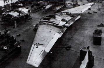 Планер ХВ-35 на заводе Нортропа в Хоутхорне Винты соединялись с двигателями с помощью длинных валов, форму обтекателей которых разработали по рекомендациям NАСА. Продолговатые обтекатели должны были иметь не только низкое сопротивление. но и служить своеобразными килями, улучшая путевую устойчивость самолета, а также препятствовать перетеканию пограничного слоя вдоль размаха крыла. Чтобы обеспечить плавное изменение сеорости вращения винтов, использовали довольно сложный двухступенчатый редуктор. Запуск двигателей осуществлялся электрическими стартерами, работавшими от двух вспомогательных силовых установок. которые состояли из электрических генераторов и двухцилиндровых бензиновых двигателей. Их установили перед третьим и шестым бомбоотсеками. Топливо размещалось в восьми двухсекционных (секции заполнялись через одну горловину) протектированных баках. Суммарная емкость баков – 30280 л. Для перегоночных полетов в бомбоотсеки могли подвешиваться дополнительные топливные баки общей емкостью 37850 л. Для питания вспомогательной силовой установки служили 2 бака общей емкостью 321,7 л. Нормальный запас масла составлял 1286,9 л, максимальный – 2271 л, и еще 37,85 л находилось в турбонагнетателях. Во всех каналах управления ХВ-35 использовали гидравлические бустеры, к которым от органов управления в кабине пилотов вела тросовая проводка. Давление в системе управления обеспечивали 4 гидронасоса с приводом от двигателей самолета. В аварийных ситуациях гидронасосы могли работать от авторотации лопастей. Резервная система управления – электрическая. На самолете установили стандартное радио- и навигационное оборудование, в т.ч. автопилот типа Х-4, радиостанцию SRC-274N (SC-274), радиокомпас AN/ARN-7, самолетное переговорное устройство AN/AIC-2. Для размещения бомбовой нагрузки предназначались 8 бомбоотсеков – по 4 в каждом полукрыле. Каждый из них имел следующие размеры: длина – 3,759 м, ширина – 1,321 м, максимальная глубина – 1,981 м. Бомболюки закрывались не традиционными створками, а тонкими стальными полосами, типа жалюзи, которые с помощью электромеханизма накручивались на ролики. Привод механизма оказался довольно сложным и отказал при первом же открытии, но в последующих полетах работал исправно. Для прицеливания при бомбометании служил прицел Norden М. Оборонительное вооружение должно было состоять из двадцати 12,7-мм пулеметов Browning М-2, установленных в дистанционно управляемых башнях. 4 двухпулеметные башни располагались на верхней и нижней поверхностях левой и правой консолей крыла. 2 четырехпулеметные башни (взяты с доработками у ночного истребителя Р-61) стояли сверху и снизу центроплана. Еще 4 пулемета находились в конце хвостового конуса. Боезапас каждого пулемета – 500 патронов, масса – 29 кг, эффективная дальность стрельбы – 1100 м. На опытных ХВ-35 оборонительное вооружение не устанавливали. Сотрудники фирмы Northrop напряженно трудились над проектом, но к началу 1944 г. стало ясно, что в отведенные сроки они не укладываются. Кроме того, анализ результатов испытаний N-9M показал, что реальные характеристики В-35 окажутся ниже требуемых. Так, дальность полета уменьшится на 2592 км, а максимальная скорость – на 39 км/ч. Командование ВВС начало выражать сомнения по поводу правильности и своевременности решения о серийном производстве В-35. Но на этом неприя