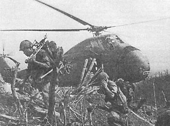 Бойцы ведут огонь из пулемета по воздушной цели Наибольшее применение нашли сейсмические датчики, которые сигнализировали о наличии движущихся объектов или взрывов боеприпасов. Сам датчик весом 11 кг монтировался в корпусе баллистической формы и сбрасывался с самолета без парашюта. При падении корпус зарывался в землю, а над поверхностью выступала лишь антенна длиной 120см. которая имела форму куста и была трудно различима в джунглях. Разбросанные вдоль дороги на расстоянии 1,5 км один от другого, датчики считали число единиц проходившей техники и передавали кодовые сигналы на борт самолетов-ретрансляторов. Затем информация поступала в вычислительный центр, где готовились данные для постановки боевой задачи штурмовикам. Другим необычным вариантом противолодочного самолета Р-2 Neptune стал "охотник за транспортом" АР-2Н. Четыре таких самолета вместо магнитометра были оснащены хвостовой стрелковой установкой с ночным прицелом, инфракрасной и телевизионной системами обнаружения и прицеливания, а также РЛС бокового обзора. Вооружение, подвешиваемое на пилонах под крылом, включало два пулеметных контейнера SVV-11A/1A, две фугасные бомбы МК 82 (по 227 кг) и две зажигательные бомбы МК 77, впоследствии самолеты были оснащены 40-мм гранатометом ХН-149 в бомболюке. В период между 1 сентября 1968 г. и 16 июня 1969 г. все четыре АР-2Н в составе VAH21 (Heavy Attack Squadron 21) сделали с авиабазы Нам Рань более 200 эффективных вылетов против речного и наземного транспорта в дельте Менонга и в районах "тропы". Другим раритетом, применявшимся в районе "тропы", стал штурмовик В-26К. Появившийся еще во время второй мировой войны и прошедший коренную модернизацию в 1964 г., этот самолет нес до пяти тонн различного вооружения и мог находиться в районе цели два часа. 609 SOS (авиабаза Накхон Фаном) с большим успехом использовал эти самолеты против движущегося транспорта в ночное время.