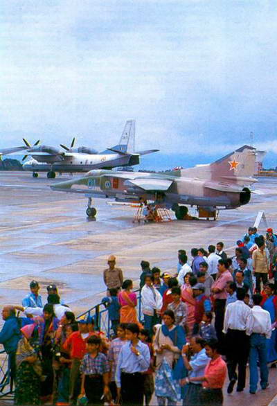 МиГ-27 Истребитель- бомбардировщик Вместе с Су-17, этот самолет в 1970-80-х годах составлял основу самолетного парка истребительно-бомбардировочной авиации СССР. Потребность в новой легкой ударной машине для советских ВВС возникла во второй половине 1960-х годов, когда военное и политическое руководство страны вынуждено было сделать вывод о том, что, помимо всеобщей ракет- но-ядерной войны с США, СССР угрожают и локальные конфликты (например, с Китаем) с применением обычного оружия. Кроме того, по изменившимся взглядам, «большая» война в Европе могла протекать и без использования атомных бомб. Однако, как оказалось, в составе фронтовой авиации отсутствует ударный самолет, соответствующий новым требованиям. Последние штурмовики Ил-10М «тихо скончались» на аэродромных свалках где-то в конце 1950-х, реактивный Ил-40, появившийся в 1953 г., несмотря на неоднократные попытки «продвинуть» его в серию, так и остался в опытных экземплярах, а сверхзвуковые Су-7Б с ролью самолета непосредственной поддержки войск справлялись неудовлетворительно: большая скорость полета этой машины не оставляла летчику времени на поиск и опознавание наземной цели, недостаточен был обзор из кабины вперед-вниз, слабо бронирование, мало число точек внешней подвески. Между тем опыт войн во Вьетнаме, Индостане и Ближнем Востоке свидетельствовал о том, что для ВВС требуется сравнительно легкий ударный самолет, способный действовать над линией соприкосновения наземных войск, бороться с танками и другими мобильными целями, наносить удары в ближнем тылу противника, поражать его коммуникации, изолируя поле боя от подхода неприятельских резервов. Такой самолет должен был нести большое число свободнопадающих бомб относительно малого калибра (ведь для того, чтобы уничтожить вражеский танк или автомобиль вовсе не обязательна «пятисотка», вполне хватит и боеприпаса калибром 50-100 кг). Новому истребителю-бомбардировщику требовался улучшенный обзор вперед-вниз, позволяющий летчику самостоятельно обнаруживать малоразмерные наземные цели. Кроме того, самолет должен был нести перспективное оборудование и вооружение, в частности прицельно-навигационную систему, лазерный дальномер и управляемые ракеты класса «воздух-поверхность». Первоначально в советской авиации на роль самолета непосредственной поддержки предназначался «фронтовой перехватчик» МиГ-23, несмотря на свое название, создававшийся, фактически, как многоцелевой самолет. Однако вскоре стало ясно, что использование этой машины в качестве низковысотного истребителя-бомбардировщика не может удовлетворить требования военных, нуждающихся в специализированном самолете с другим оборудованием, вооружением и улучшенным обзором для летчика. ОКБ А.Н. Микояна и раньше занималось созданием тактических ударных самолетов. Не лишне вспомнить, что еще в 1939-1940 гг. там велись работы над одноместными бронированными штурмовиками ПБШ-1 (моноплан) и ПБШ-2 (биплан), оснащенными двигателем АМ-38 (1 х 1600 л. с.) и двумя пушками Таубина калибром 23 мм. В 1950 году был построен самолет МиГ-15СУ - истребитель-штурмовик с двумя пушками Ш-23 (23 мм), подвижными в вертикальной плоскости (поворачивались только вниз), в конце 1950-х - начале 1960-х гт. многие фронтовые истребители МиГ- -15бис и МиГ-17 были переклассифицированы в истребители-бомбардировщики. Таким