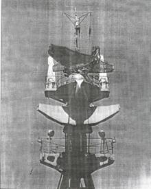 П-35 В отличие от разработки П-6, при создании ракеты П-35 (4К44) ставилась задача уменьшить габариты и вес изделия по сравнению с П-5. Это определялось исходя из условий размещения на корабле класса «эсминец». Решению этой задачи способствовало оговоренное в требованиях флота уменьшение веса боевой части, что позволило укоротить ее на 0,5 м. Созданная в ГСКБ-47 боевая часть при весе 560 кг оснащалась 405 кг взрывчатого вещества и имела длину 0,95 м при диаметре 0,69 м. Умеренные требования по максимальной дальности позволили сократить запасы топлива. Однако для хотя бы частичного выполнения поставленного ограничения по длине (не более 9,5 м) ОКБ-ЗОО под руководством С. К. Туманского потребовалось подготовить для ракеты новый двигатель КР-7-300, который при тяге в наземных условиях 2,1 т, примерно равной применяемому на П-5 и П-6 КРД-26, был короче на 0,5 м. Кроме того, к П-35 предъявлялись более высокие требования по скорости полета, чем к П-6. При близких массогеомет- рических характеристиках, обводах ракет и тяговых параметрах двигателей в наземных условиях в распоряжении конструкторов оставался еще один инструмент повышения скорости – обеспечение более благоприятных условий работы на больших скоростях путем снижения потерь давления на входе в воздухозаборник за счет применения полуконического центрального тела. Присутствие этого конструктивного элемента стало основным отличием внешнего облика П-35 от П-6. Разработку системы управления в целом в НИИ-10 возглавил К.А. Петров (после его кончины – А.С. Миронов), бортовой аппаратуры «Блок» – Л.Е. Хазанов, корабельной аппаратуры «Бином» – Л.Е. Хазанов. При этом были использованы результаты ранее выполненных в НИИ- 10 проработок по системе «Вектор», предназначавшейся для усовершенствованного варианта «оморяченной» «Кометы» – комплекса «Стрела» для вооружения крейсеров. Бортовая радиотехническая аппаратура обеспечивала прием и исполнение команд радиоуправления со стреляющего корабля, обзор поверхности моря в секторе ±40°, трансляцию полученного радиолокационного изображения на корабль, захват назначенной с корабля цели и ее автосопровождение, выдачу сигналов на канал автоответчика. Кроме этой системы в состав бортовой аппаратуры «Блок» входили и другие компоненты, в том числе автопилот АПЛИ-1 и радиовысотомер РВ-6В. В конечном счете длина П-35 была уменьшена примерно на 1 м по сравнению с П-5 и П-6, составив 9,8 м. Диаметр фюзеляжа равнялся 0,86 м, размах крыла – 2,67 м при стреловидности по 1/4 хорды 65°. Стартовый вес ракеты составил 4,2 т, вес со сброшенными ускорителями – 3,8 т. Ракета оснащалась стартовым агрегатом с двумя двигателями СПРД-38, развивающим суммарную тягу 60 т при времени работы 1,2-1,55 с. Каждый двигатель комплектовался распложенными в два яруса 14 пороховыми шашками. После старта ракета набирала установленное перед пуском заданное значение высоты полета (400,4000 или 7000 м), поддерживаемое поданным баровысото- мера. Наведение на цель могло осуществляться как по известным координатам ракеты и цели, так и при работающем радиолокационном визире по относительным координатам ракеты и цели. После стробирования по дальности, выбора и захвата цели на уверенное автосопровождение головкой самонаведения ракета постепенно снижалась и переходила в горизонтальный полет на высоте 100 м. При отказе радиовысотомера