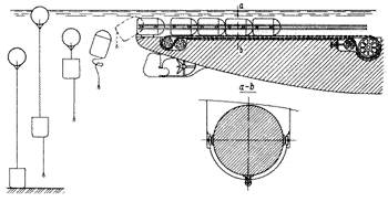 Четвертый, последний, вариант заградителяЧетвертый, последний, вариант подводного минного заградителя М.П. Налетова, принятый к постройке, представлял собой лодку водоизмещением около 500 т. Его длина 51,2, ширина по миделю 4,6 м, глубина погружения 45,7 м. Время перехода из надводного положения в подводное 4 мин. Скорость в надводном положении 15 уз при суммарной мощности четырех моторов 1200 лс, в подводном положении - 7,5 уз при суммарной мощности двух электромоторов 300 лс. Число электрических аккумуляторов - 120. Дальность плавания надводным (15-узловым) ходом 1500 миль, подводным (7,5-узловым) - 22,5 мили. В надстройке установлены две минные трубы. Число мин - 60 шт. системы Налетова, с нулевой плавучестью. Число торпедных аппаратов - два с четырьмя торпедами. Корпус заградителя состоял из сигарообразной части (прочного корпуса) с водонепроницаемой надстройкой по всей длине. К прочному корпусу крепилась рубка, окруженная мостиком. Оконечности были выполнены легкими. Главная балластная цистерна помещалась в середине прочного корпуса. Она была ограничена обшивкой прочного корпуса и двумя поперечными плоскими переборками. Переборки соединялись между собой горизонтально расположенными трубами и анкерами. Всего труб, соединявших переборки, было семь. Из них труба наибольшего радиуса (1 м) находилась в верхнем отделении, ось ее совпадала с осью симметрии лодки. Эта труба служила для прохода из жилого отсека в машинное отделение. Остальные трубы были меньшего радиуса: две трубы по 0,17, две - 0,4 и две - 0,7 м. По первым двум трубам из главной вентиляционной трубы в жилое помещение подавался свежий воздух, а четыре остальные трубы служили балластными цистернами высокого давления. Кроме того, были предусмотрены носовая и кормовая балластные цистерны. Помимо цистерн главного балласта, имелись носовая и кормовая дифферентные цистерны, уравнительные цистерны и торпедозаместительная цистерна. ![]() Схема устройства для постановки мин с цепной передачей Как уже упоминалось, 60 мин размещались в двух минных трубах, расположенных в надстройке. Мины должны были двигаться по рельсам, проложенным в минных трубах, при помощи цепного или тросового устройства, приводимого в движение специальным электромотором. Мина с якорем составляла одну систему и для ее движения по рельсам служили четыре ролика. Регулируя число оборотов мотора и изменяя скорость заградителя, изменяли таким образом расстояние между ставящимися минами. Согласно спецификации детали минных труб должны были быть разработаны после исполнения конструкции мин и испытаний их на специальном понтоне. Из сравнения четвертого варианта с предыдущим видно, что водоизмещение лодки увеличено с 470 до 500 т, длина - с 45,7 до 51,2 м, скорость в подводном положении - с 7 до 7,5 уз, а суммарная мощность электромоторов - с 250 до 300 лс, дальность плавания в надводном положении (15-узловом ходе) - с 1000 до 1500 миль. Уменьшено время перехода из надводного положения в подводное с 5,5 до 4 мин. Глубина погружения лодки увеличена с 30,5 до 45,7 м. Если в первом варианте цистерны главного балласта находились в междудонном пространстве, а в третьем варианте - по бортам лодки, то в последнем варианте они расположены в средней части лодки (а также в ее оконечностях) и получили более сложное оформление. Изменение вооружения произошло за счет увеличени