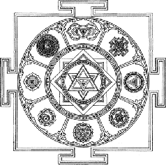 Нади и чакры Срединная Сушумна-нади (огня) восходит через центр тонкого тела По левую и правую стороны от неё проходят Чандра-нади (луны) и Сурья-нади (солнца) соответственно. Ширина этих каналов обычно приравнивается к тысячной доле толщины волоса. Лунная и солнечная нади входят в Сушумну (соединяются с ней) в Муладхаре и восходят в область Аджны, где они затем спускаются в левую и правую ноздри, тогда как Сушумна поднимается в Сахасрару. Из двух ноздрей исходят каналы праны, которые выносят дыхание на расстояние двенадцати пальцев. В основании Сушумны, в промежности, располагается Муладхара, где слит Кундалини как свернувшаяся кольцами змея, причём её голова обозначает луковицу (канду), вход в Сушумну. Муладхара описывается как имеющая четыре лепестка (четыре сплетения нади) и обозначается квадратным жёлтым Элементом Земли. Над ней располагается Свадхистана (в области лобка), обладающая шестью лепестками и обозначаемая белым полумесяцем Элемента Воды. Возле пупка расположена Манипура с десятью лепестками, она обозначается красным треугольником Огня. Около сердца находится Анахата с двенадцатью лепестками, она обозначается синей гексаграммой Воздуха. В гортани расположена Вишуддха-чакра с шестнадцатью лепестками, она обозначается белым кругом Элемента Пространства. В центре лба находится Аджна с двумя лепестками, она обозначается уже не одним из пяти элементов, а тонкой сутью ума. Голову венчает Сахасрара, сверкающий лотос с тысячью лепестков Каждая чакра описывается как содержащая различные божества и биджа-слоги в своём центре и на каждом из своих лепестков. (Не следует думать, что там присутствуют некие реальные цветки лотоса или помещённые на них буквы. Эти и другие понятия используются с тем, чтобы представить определённые реальности йогического опыта. - Артур Авалон.) Говорят, что скрытые чакры - Голата, Палата и Лалана - расположены на язычке в задней части гортани, над Аджной и в области верхнего мягкого неба. Йогическая работа с ними выполняется главным образом в Кхечари-мудре, хотя Вималананда говорит, что возможна практика и без неё В Кхечари-мудре уздечка языка постепенно перерезается до тех пор, пока язык не сможет коснуться точки между бровями. Затем язык поворачивается вовнутрь и вверх, оказывая давление и входя в проток «двуглавой змеи и запечатывая десятую дверь» внутри черепной полости над мягким небом. Давление языка на «Ама Кала» - вместилище лунного нектара - побуждает лунный нектар (амриту; сому) обильно стекать вниз и наполнять всё тело высшим блаженством. Достижение Кхечари-сиддхи дарует божественное тело бессмертия, свободное от старения, разрушения и болезней, наделённое восемью великими магическими сиддхами «Двуглавая змея» - это канал, который тянется от задней стороны гортани до «луны», расположенной как раз над Аджной. «Десятая дверь» -это десятое отверстие тела. «Ама Кала» - это подлинный философский камень бессмертия. «За Муладхара-чакрой следует Свадхистана, соответствующая Элементу Воды и воспроизводству. Когда Кундалини окончательно покидает Свадхистхану, садхака (практикующий садхану) познаёт Элемент Воды. В каждой чакре ты получаешь объемлющее знание того элемента, который она представляет, и все сгустки прошлого опыта выводятся из вашего причинного тела. Ты должен усмирить по